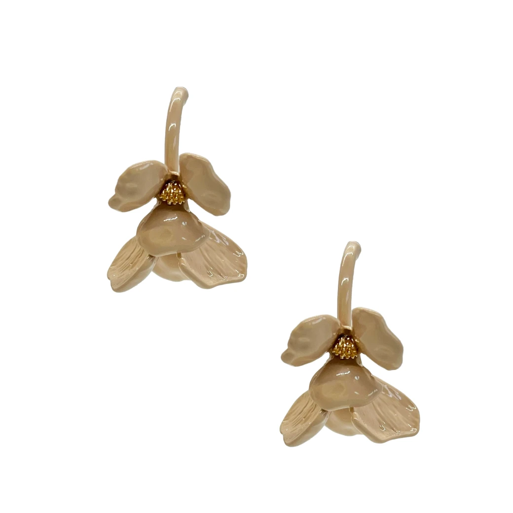 These lacquered au last floral hoops add a touch of elegance to any look, but we particularly love them paired with our embroidered Blanche dress in white. Lightweight and comfortable, we love the position of the flower that sits effortlessly just below the lobe.