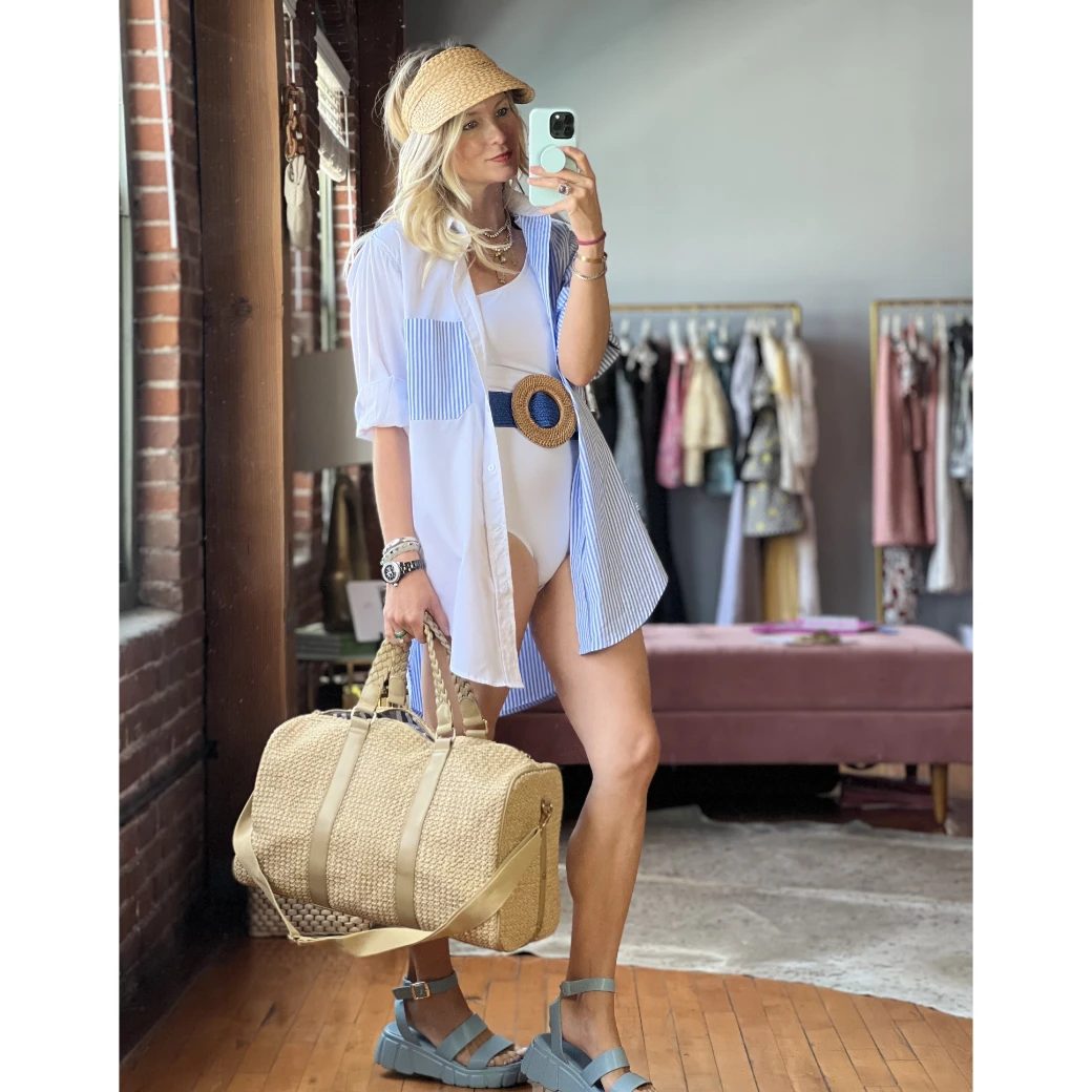The perfect bag for any summer getaway, this raffia and vegan leather tote holds all the “mom things” + looks super chic. Added bonus, it’s really light weight to start and has a sturdy crossbody strap so you can use your hands when needed (which is pretty much always, right?) Fully lined with interior pockets..