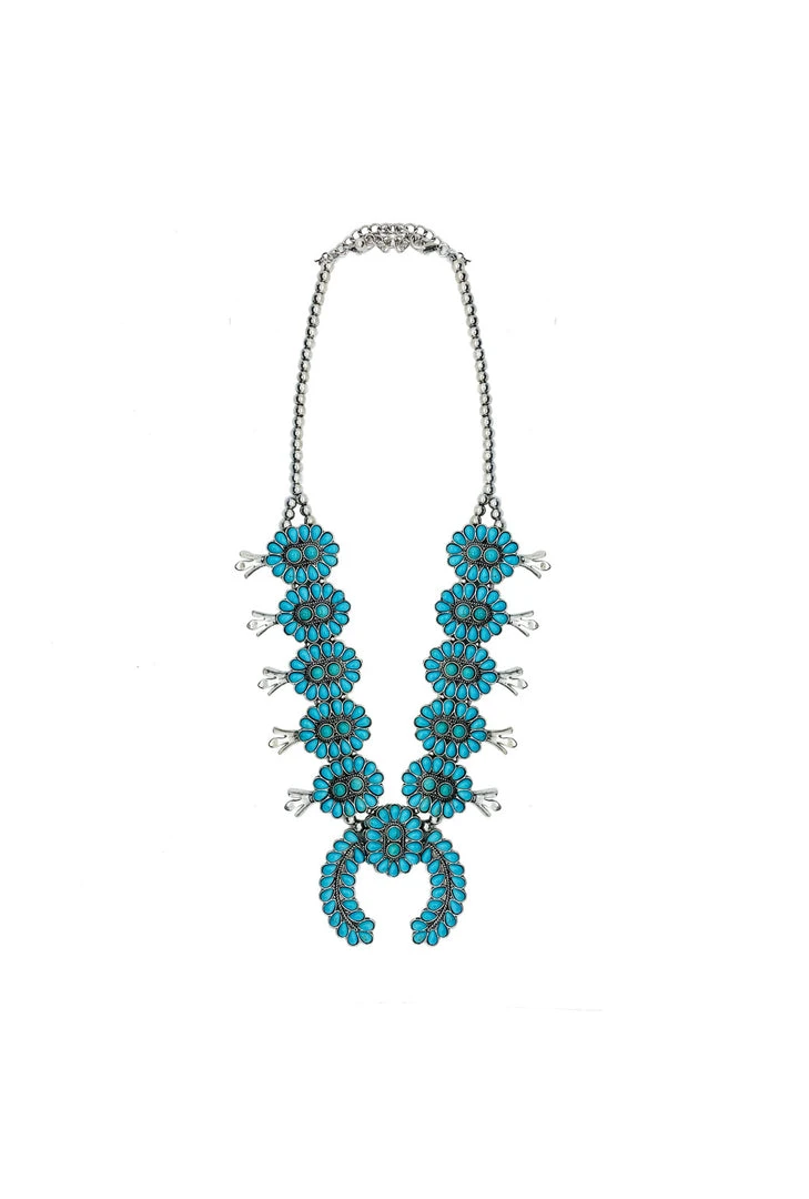 This Squash Blossom statement necklace adds bold beauty to your look. We love how it brings even the simplest “mom look” to life. Crafted out of silver plate with faux turquoise, this colorful bauble is sure to become a classic go-to in your jewelry box.