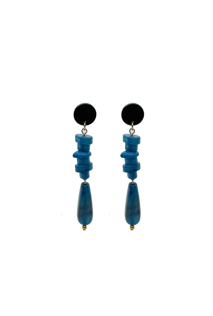 These happy, blue hue colored, stacked baubles add a pop to any look. Though dramatic in length, they are lightweight and comfy enough to wear ALL day long. We love them styled with reds, whites and blues for every Americana BBQ this summer season.
