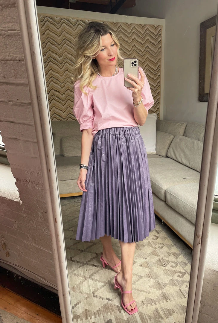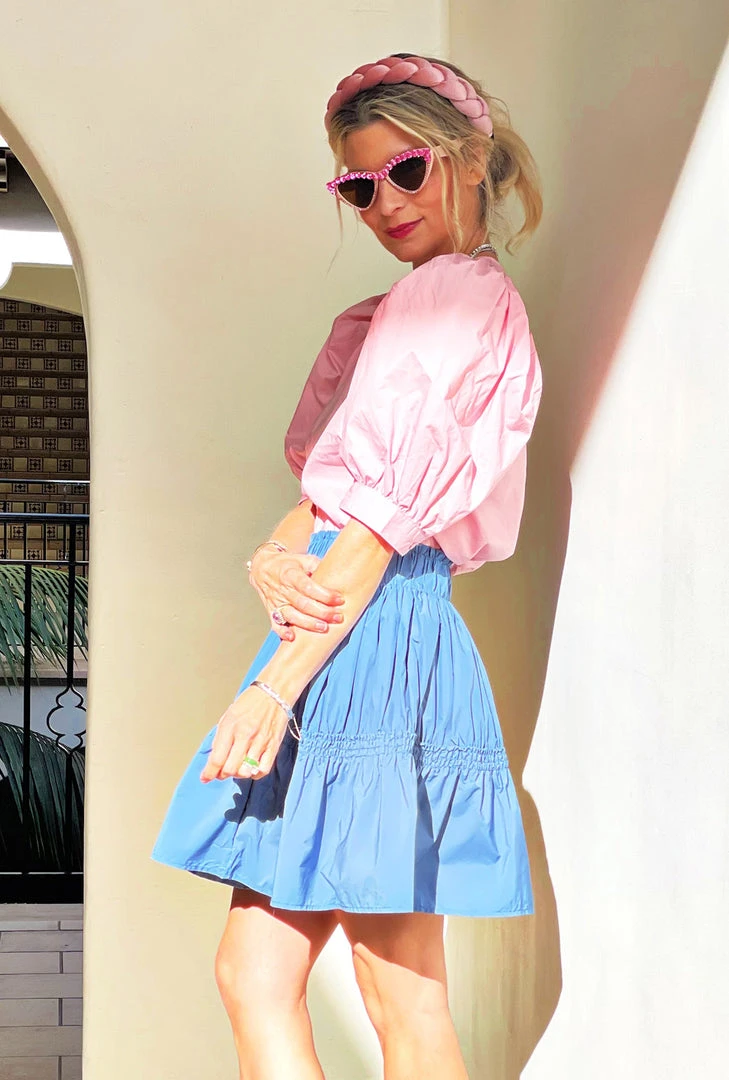 If you love pink and puff sleeves…then boy do we have the perfect top for you! This crisp, cotton poplin top is light, airy and makes a BIG statement. Style it with white jeans for an easy, everyday look, with our Lilac Faux Croc Skirt for an easy office or date night look, or with our Pink Lamé Party Skirt for a fun fête!