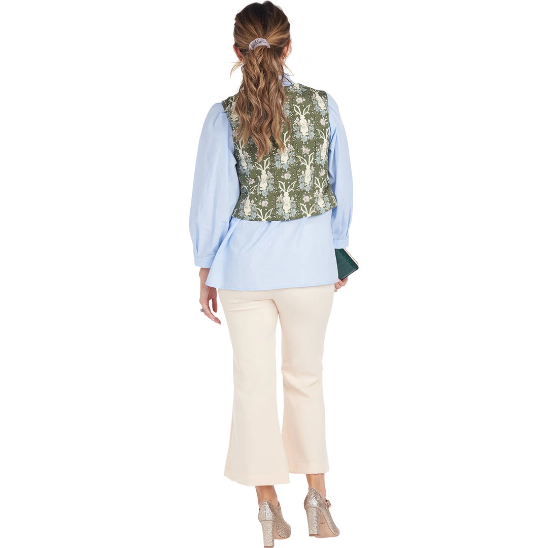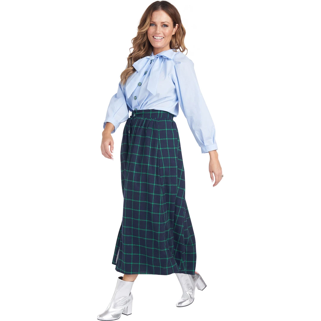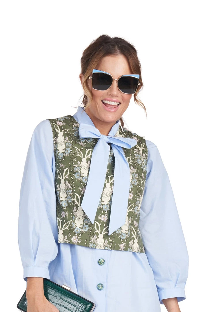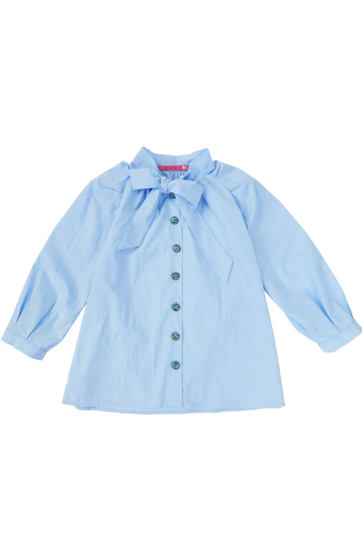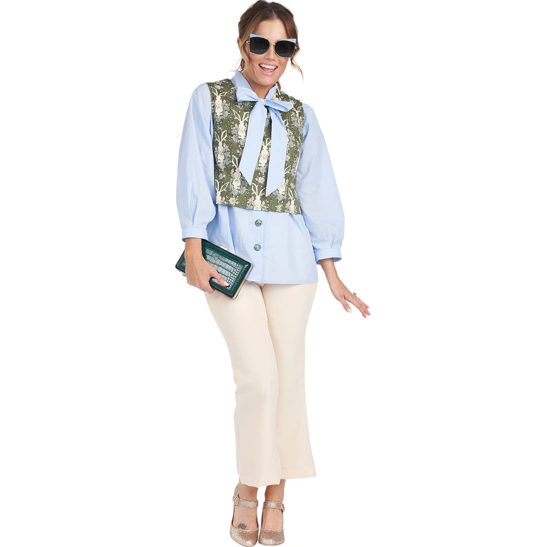 Our classic Bow Blouse, in crisp, blue cotton poplin is a wardrobe staple with flare. Colorful green abstract print buttons add a stylish touch and the forgiving silhouette won’t hug your mum-tum. Keep it more casual untucked with skinny jeans for a comfy, yet properly put together look or tuck it into a skirt or high-rise trousers for a more professional, yet feminine vibe.