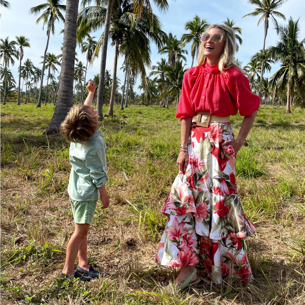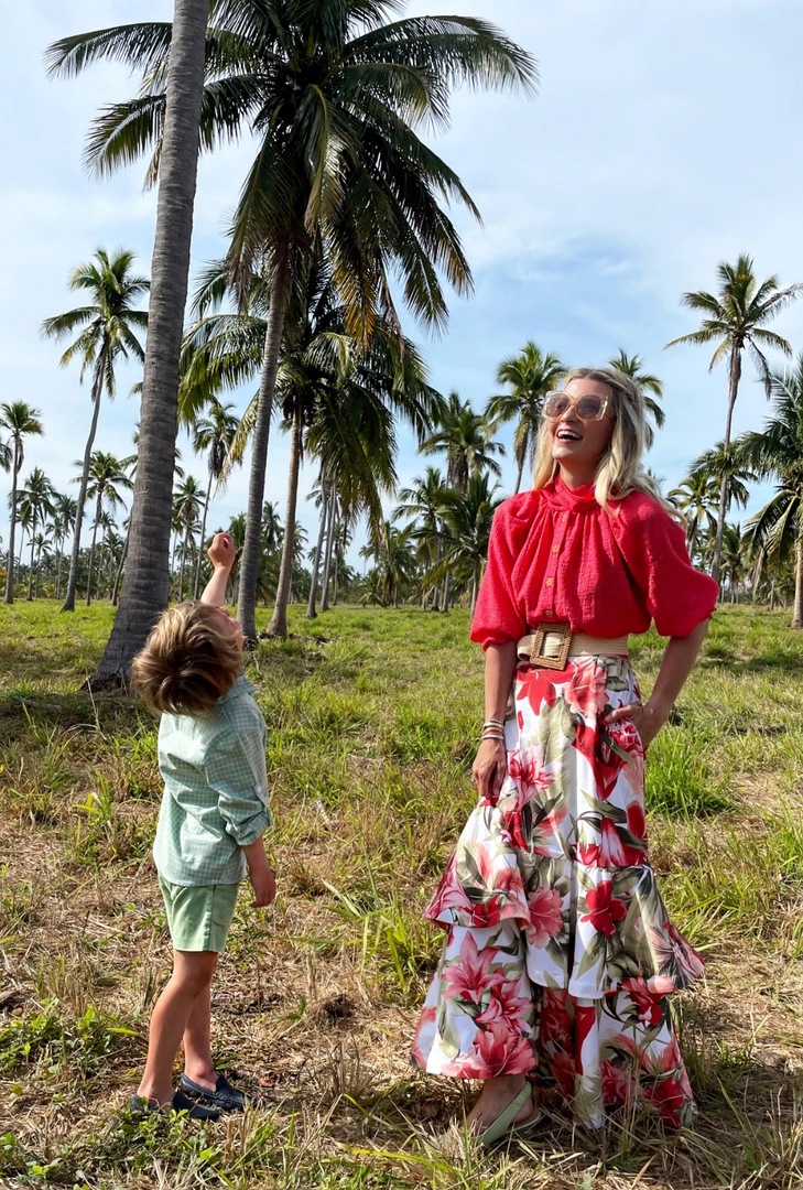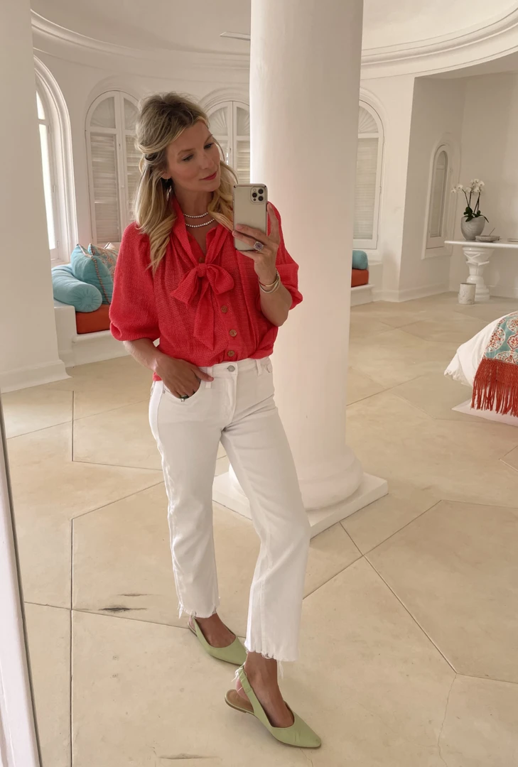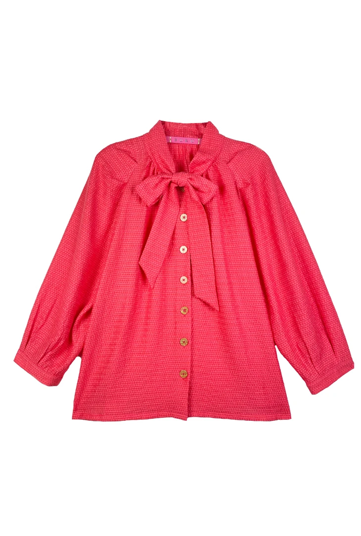 A little bit lady, and a lot of fun—our puff sleeve bow blouse in bold textured coral elevates your denim game or polishes off your party attire. Raffia and lucite buttons give it something extra and the lightweight, yet forgiving silhouette won’t hug your mum-tum.