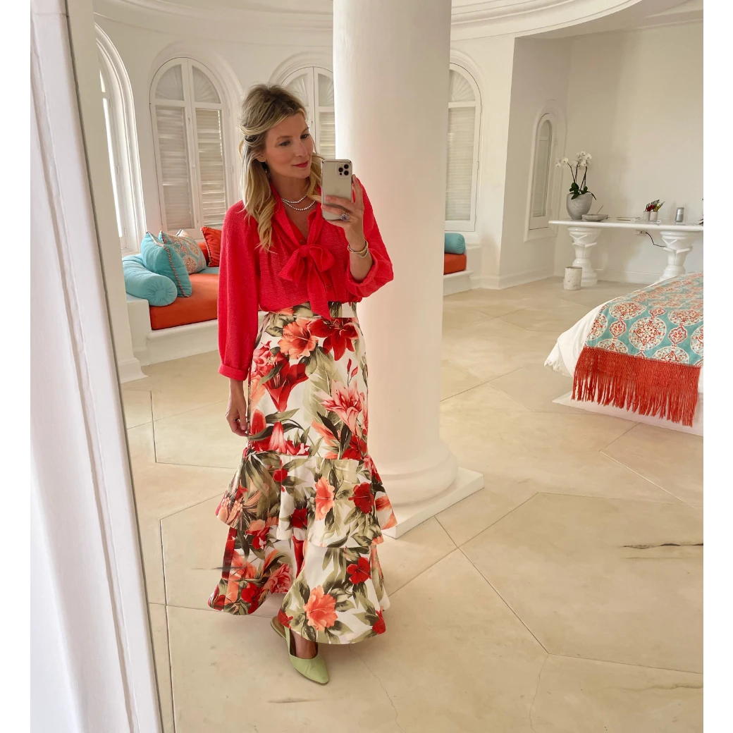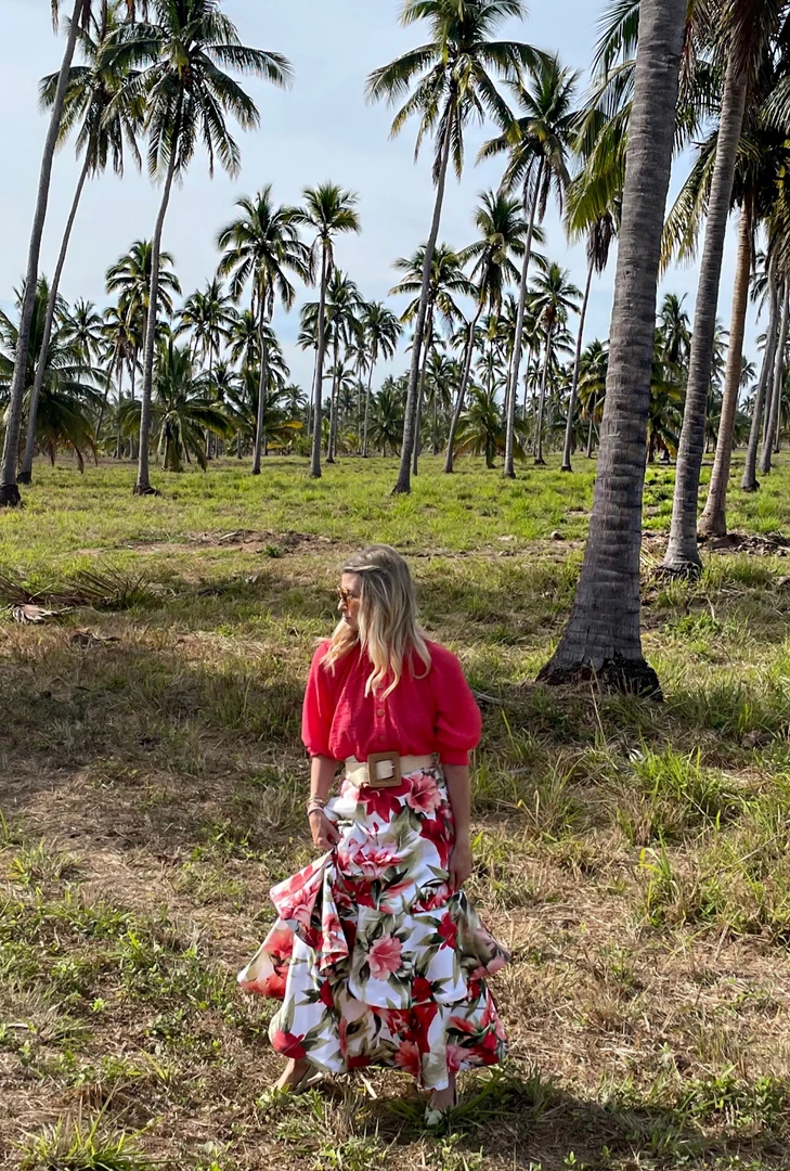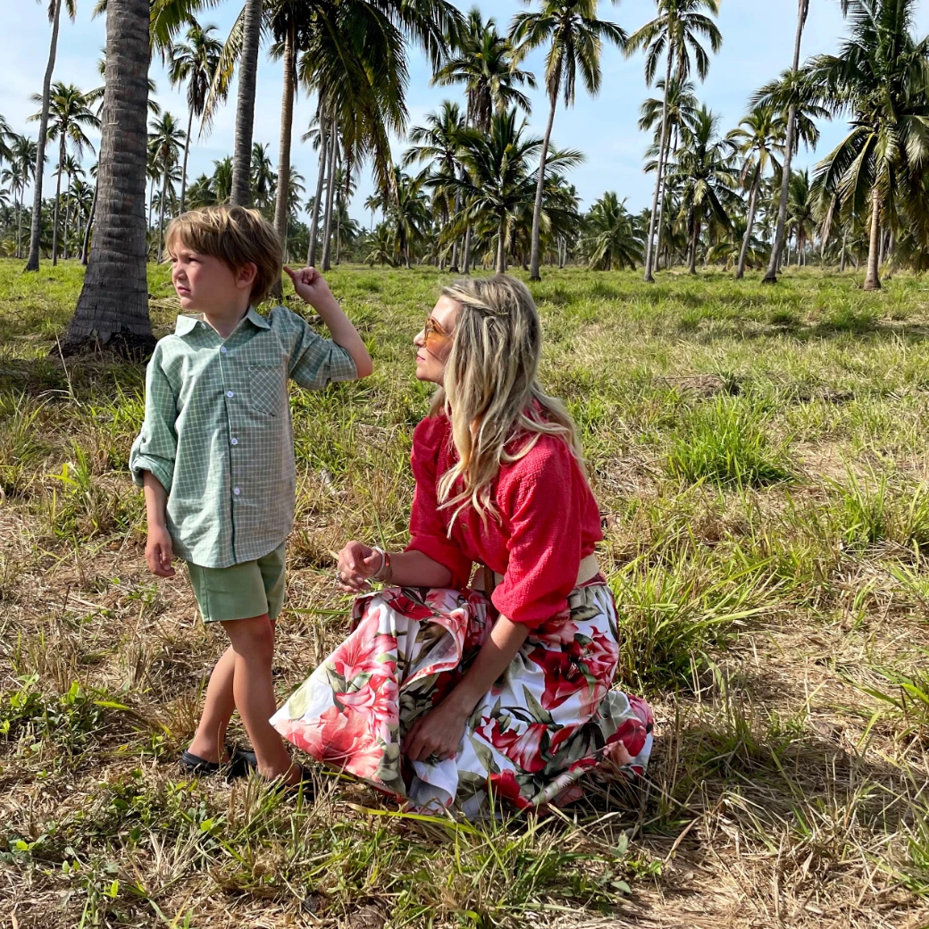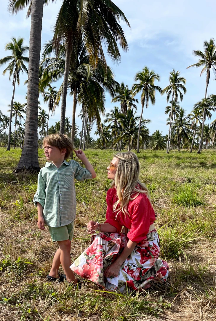 A little bit lady, and a lot of fun—our puff sleeve bow blouse in bold textured coral elevates your denim game or polishes off your party attire. Raffia and lucite buttons give it something extra and the lightweight, yet forgiving silhouette won’t hug your mum-tum.