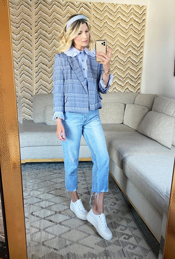 Size Small measures 21″ shoulder to hem. The Blue Textured Rose fits slightly bigger than the Ivory Tweed Boxy Blazer.