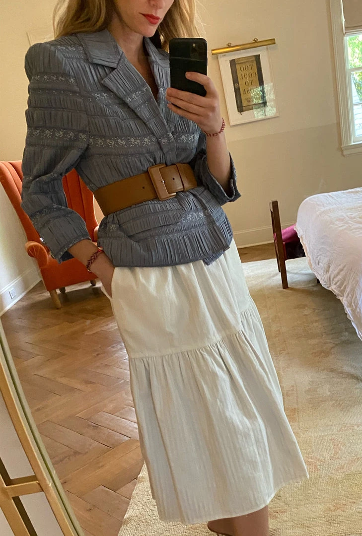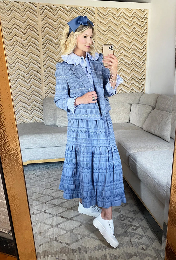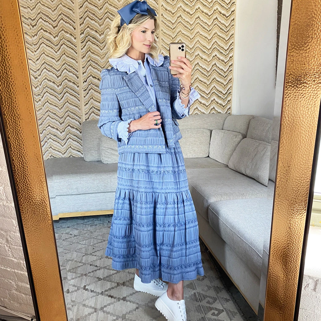 This rose embossed textile is the cottage-core version of a denim jacket. With just the right amount of stretch for comfort, unlined sleeves for season-less wear and a boxy fit to accommodate various body types—this #BURUxBrooklyn blazer is the jacket you didn’t know you were missing. Toss it over your shoulders to elevate any look or pair it over its matching shirtdress or tiered mini skirt for the ultimate Brunch look.