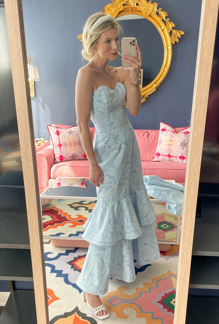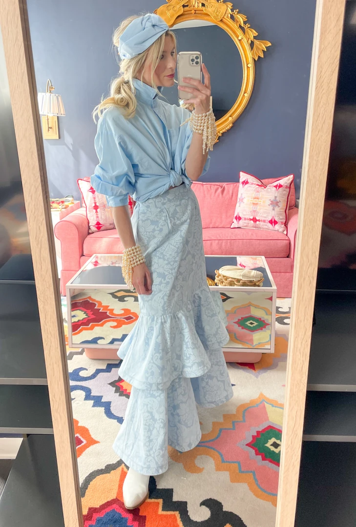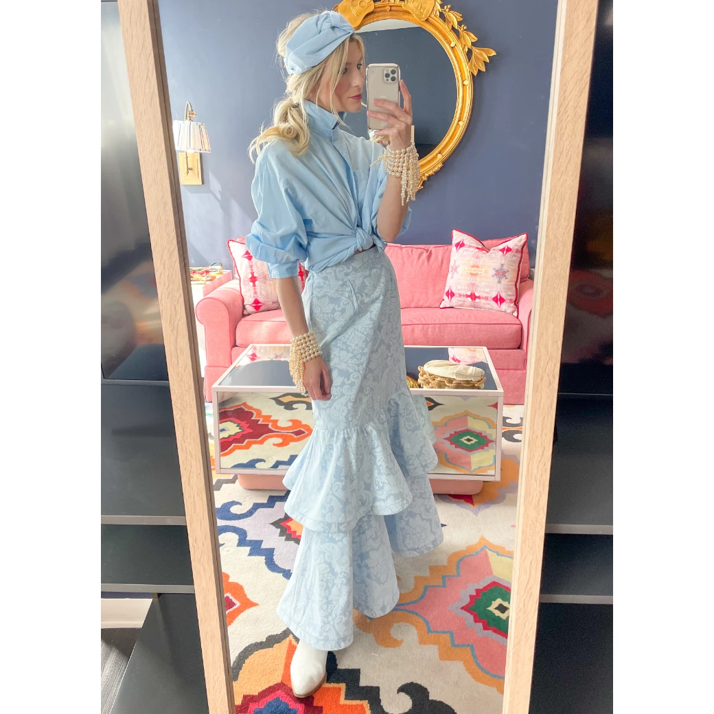A fresh take on our best-selling Teagan Skirt, the new Trumpet Teagan pairs the flare with a more streamlined silhouette through the hips. We love it paired with its matching Sweetheart Bustier for a formal affair or with a t-shirt and our BURU x Hunter Blake Walking Blazer in blue tweed for a cool but casual vibe. With an elastic waist back for comfort and POCKETS, you may never wear another maxi skirt again. Not to toot our our trumpet. Ha ha!
