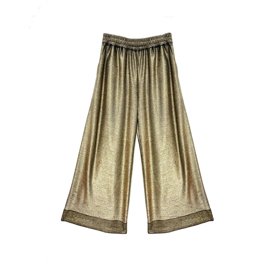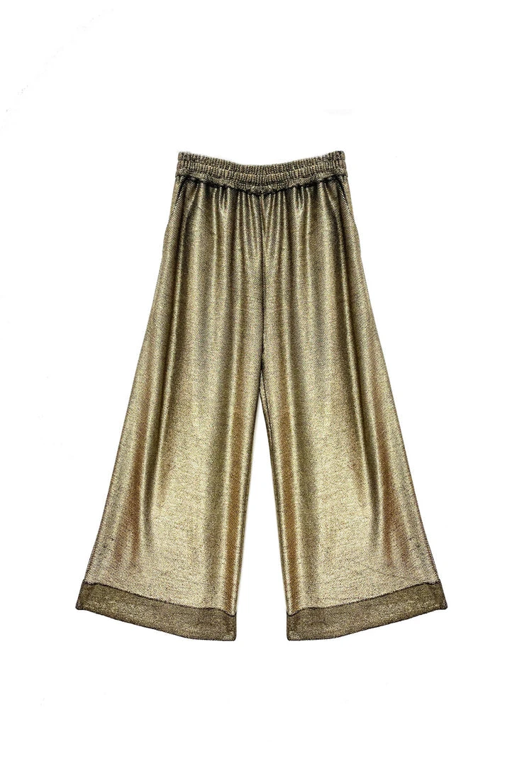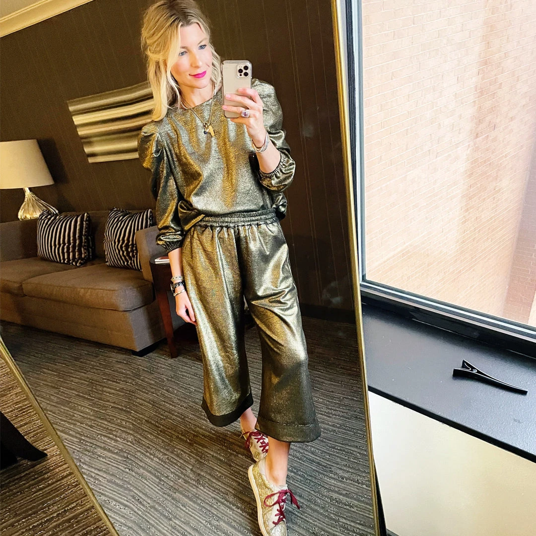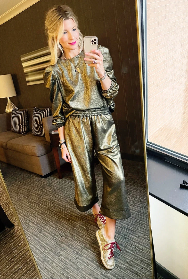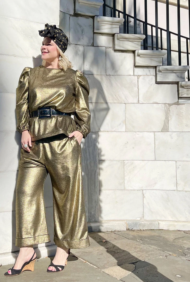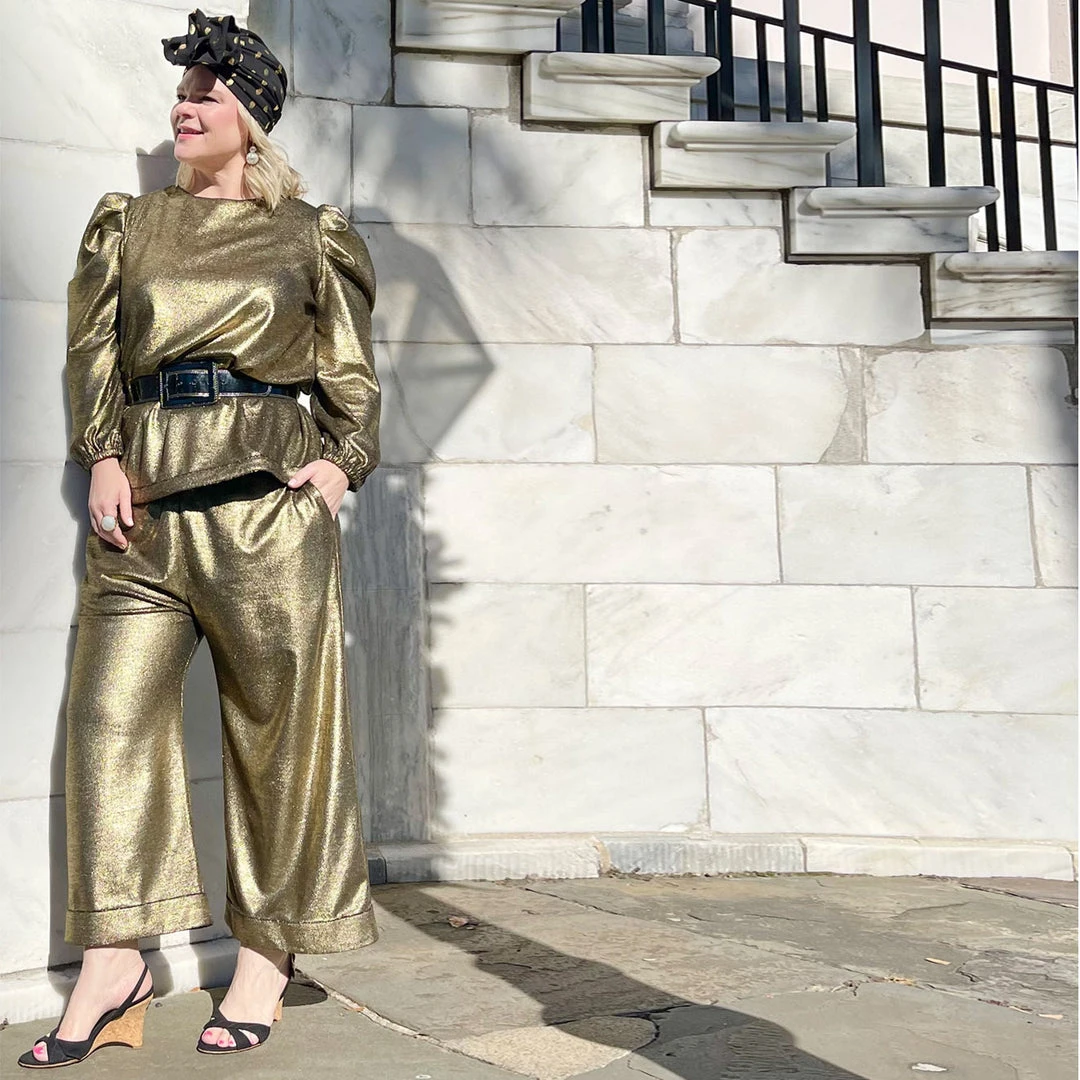 We’ve never met a metallic we didn’t love (nor has Julianne Taylor, aka JUJU) so when we discovered this super soft, gold liquid knit, we knew we had to turn it into an elevated lounge set. These Wide Leg Cropped Trousers, paired with its matching Long Puff Sleeve Top OR Tunic (take your pick!), it can easily be dressed for daytime tasks with sneakers or styled for more festive occasions with heels.