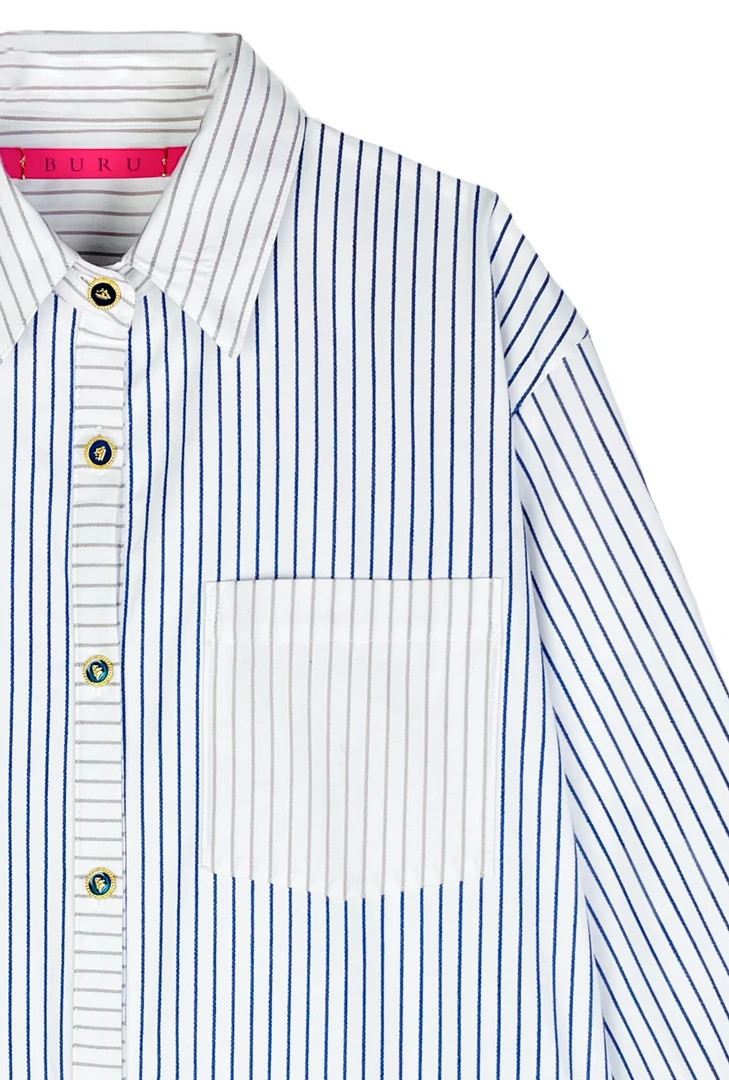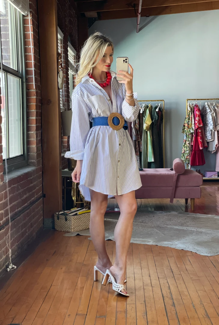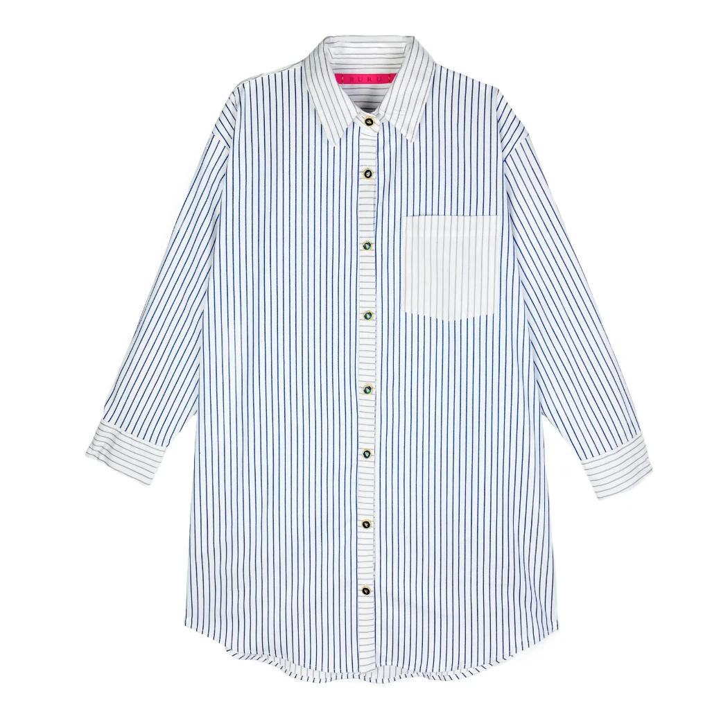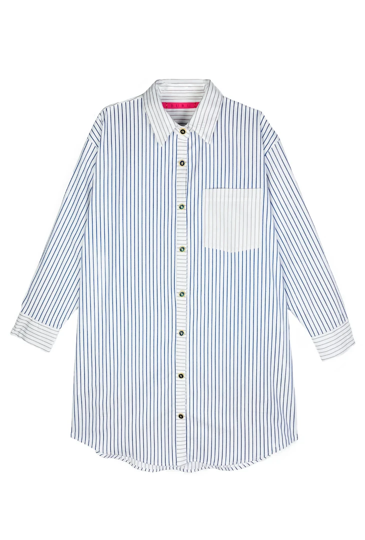 We love the ease of our Boyfriend Shirt so much that we decided it was time to turn it into a proper dress! Effortless, comfortable and with pockets—our Boyfriend shirtdress is a grab & go staple. Made of a super cool, two-faced textured cotton in blue & white stripe, with contrast cuff, placket and collar in taupe and white stripe, you will love styling this piece season after season.