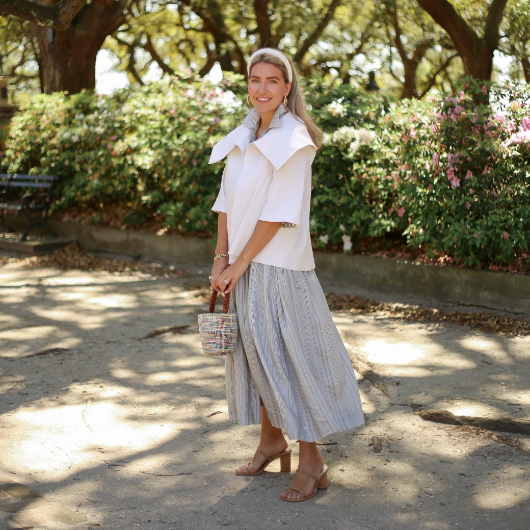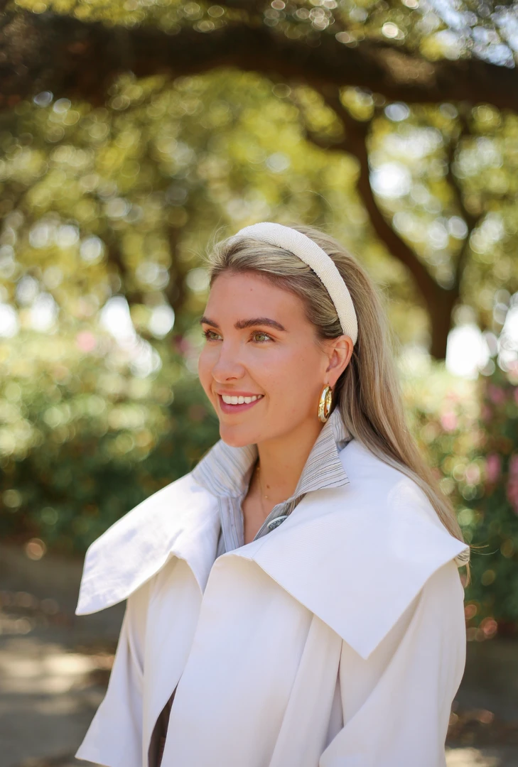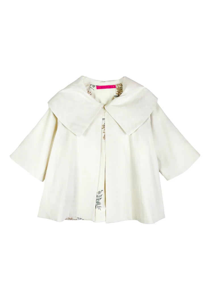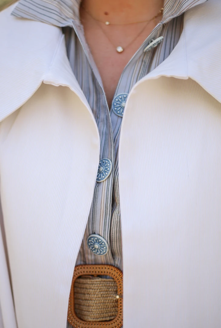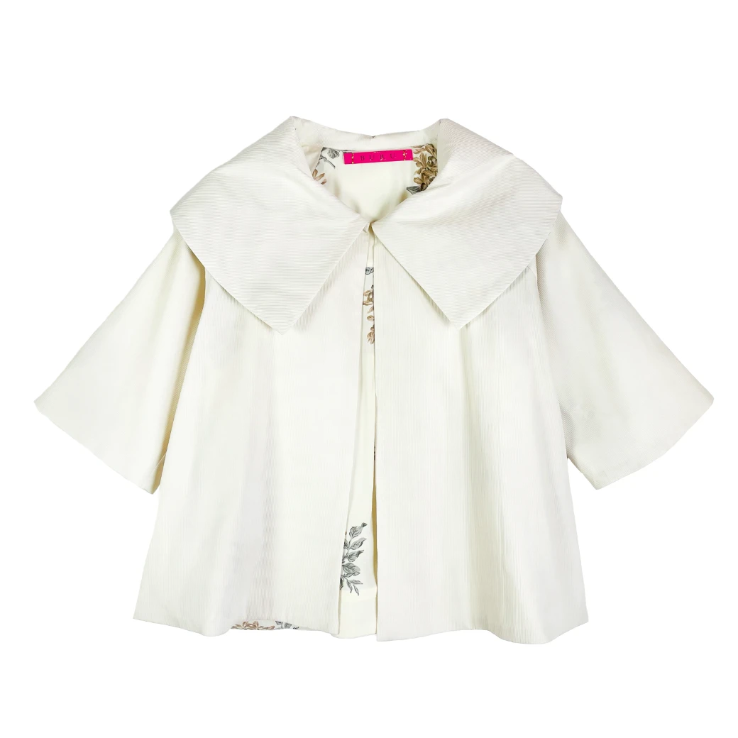 This stunning cropped car coat (with pockets!) in an off-white cotton faille is such a classic piece to add to your wardrobe. Toss it on over jeans a t-shirt for a put-together everyday look or elevate it by pairing it with our Blue and Tan Striped Shirtdress. The jacket is fully lined in a light weight cotton.