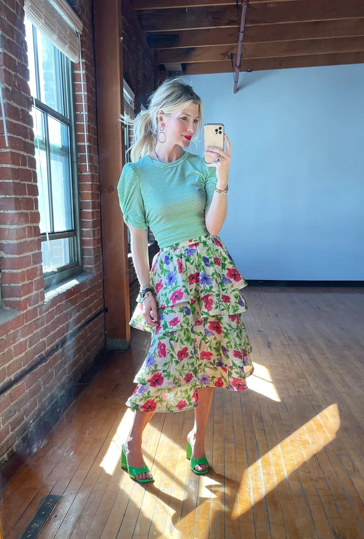 Light and airy, our BURU x TSC Ruffled Party Skirt brings all the fun! Created with tiered layers of our signature floral print, we love her styled with our Sivas Statement T-shirt in green and white stripe OR you can go head to toe floral by layering it over our Ruffle Midi Dress in the same print! Looking to dress it down? We love it paired with our Color Block Cord Sneakers.