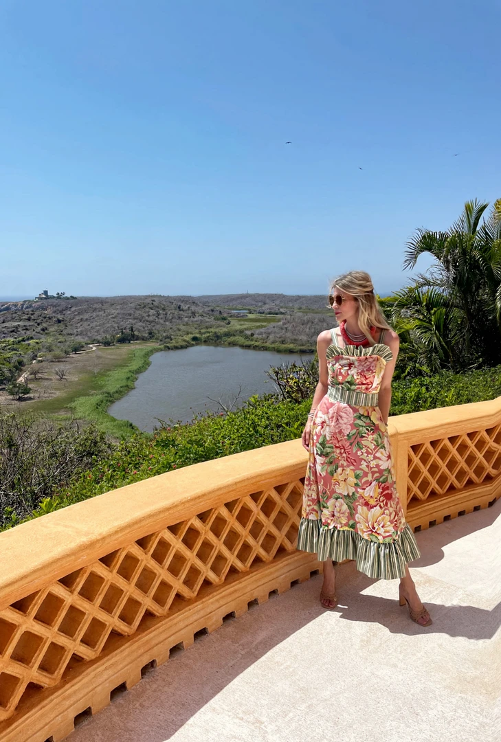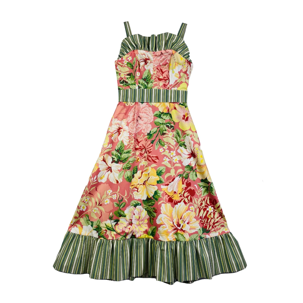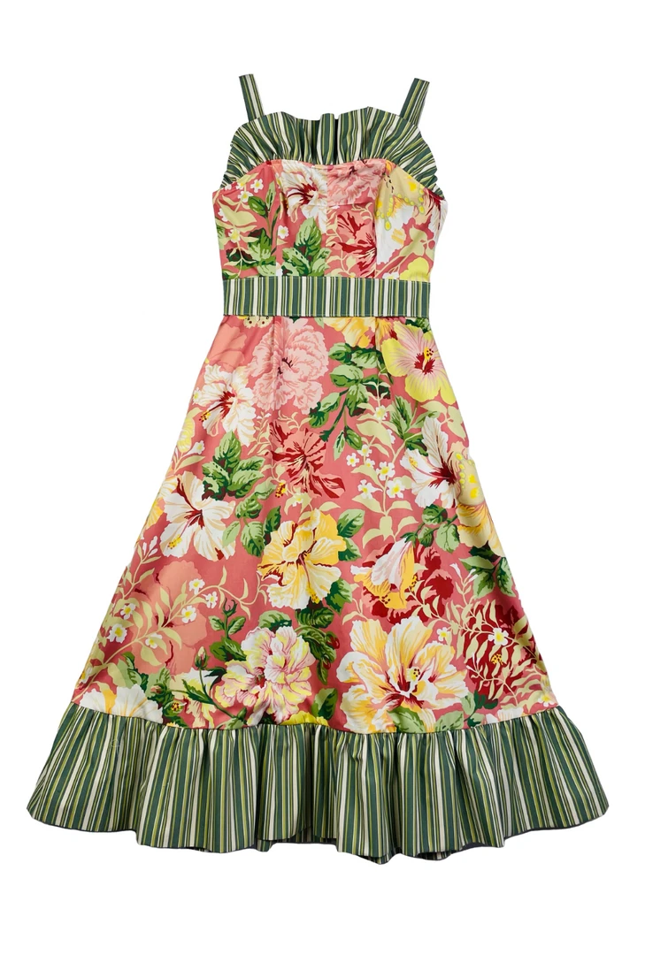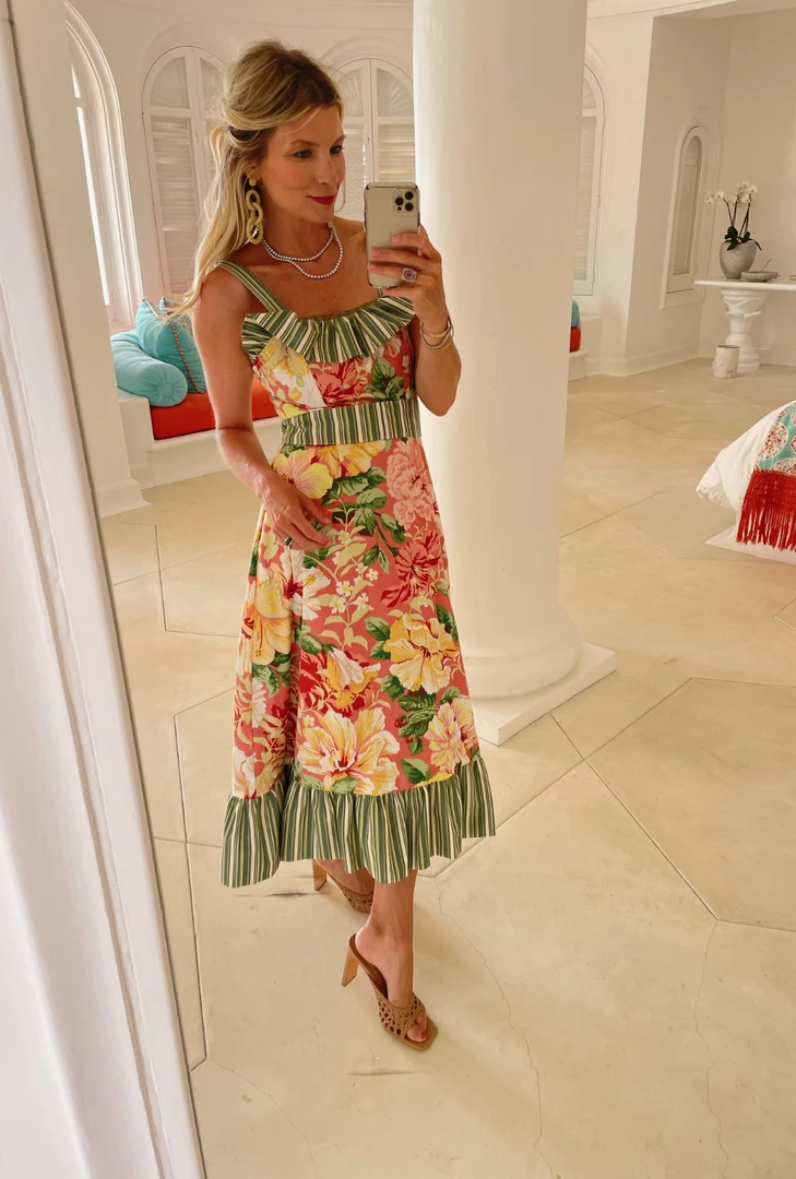 This fresh BURU silhouette, aka the Button Top Sundress is flirty, fun and fantastically comfortable. An elastic waist back allows for a flexible fit. Multiple button holes in the straps allow easy adjustments or criss-crossing the back OR you can remove the straps all together. Fully lined with big pockets, this 100% cotton poplin, bold floral print dress is all the ruffled crispness you didn’t know you needed.