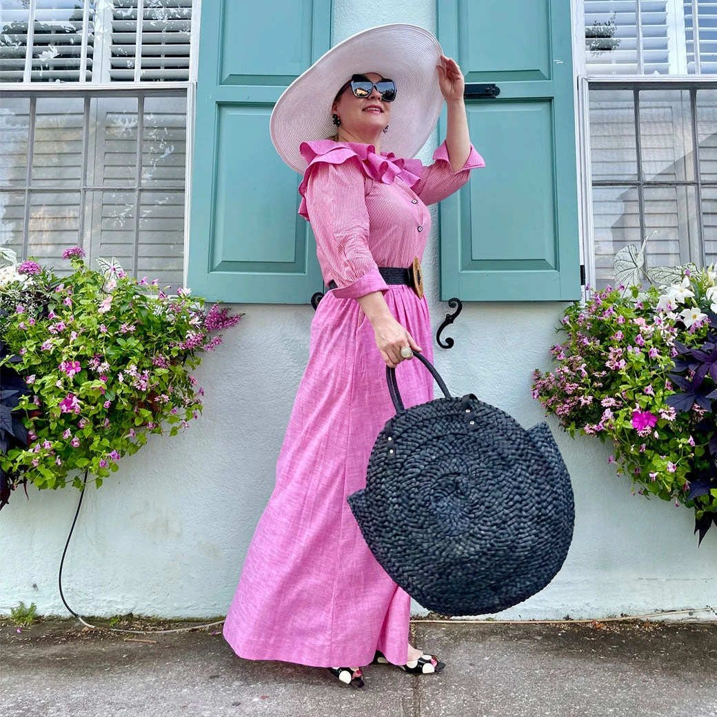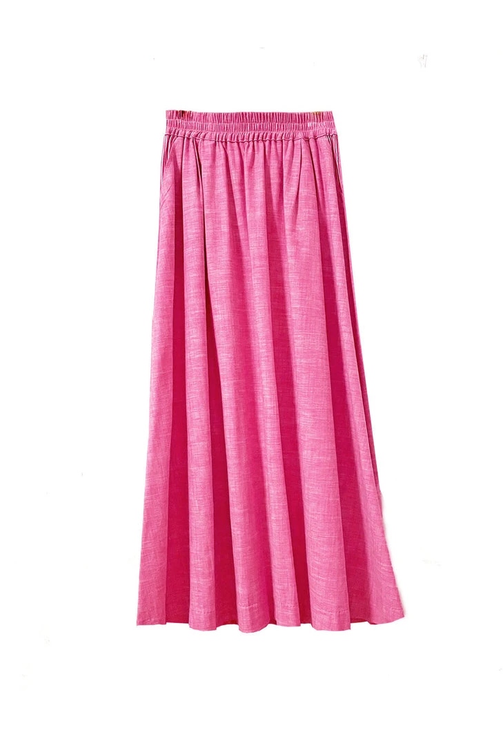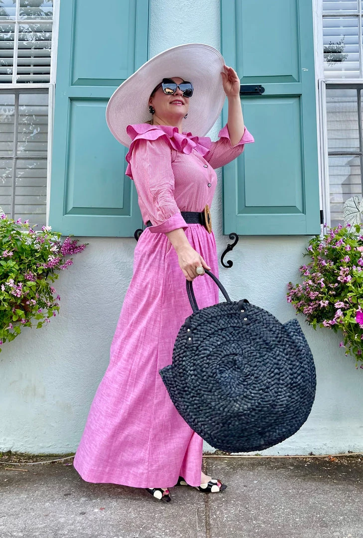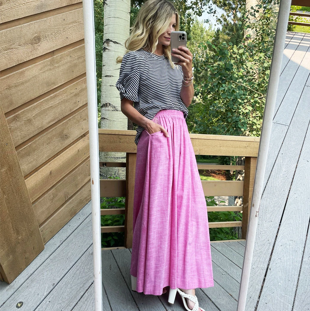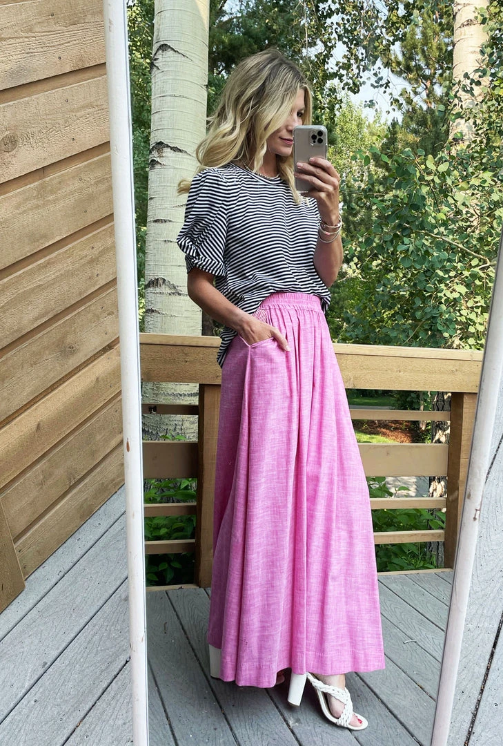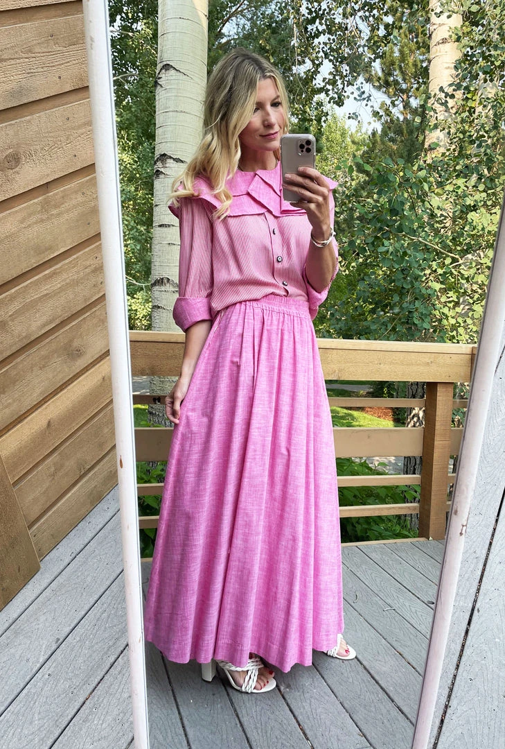 The greatest thing about an elastic waist maxi skirt is that it is so easy to wear, and yet it makes you look and feel so fancy. This skirt is not only super comfortable, but this pink oxford is super dreamy. Pair it with the matching ruffle blouse for a total look or wear it with a Sivas Statement Tee to be casual and still look great!