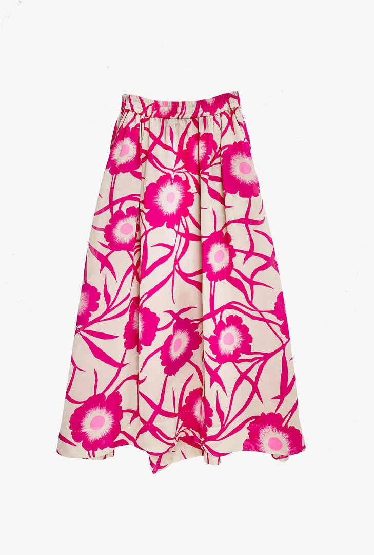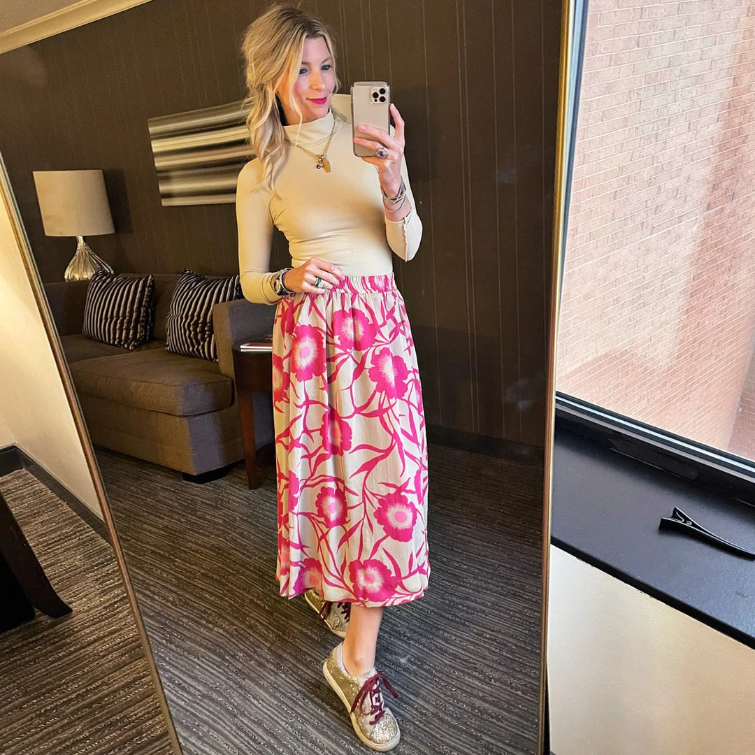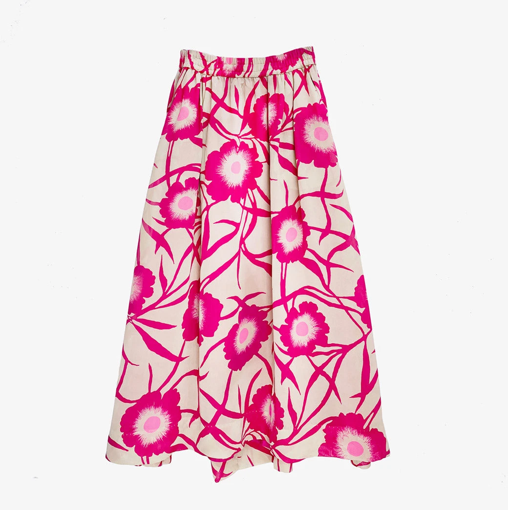 This striking #BURUxJUJU skirt features a bold hot pink floral in a lightweight crepe textile. Fully lined in 100% hot pink cotton with pockets and an elastic waist, she’s as comfortable as she is fun! We love to pair her the matching bow blouse for a “dress” look or focus on her separately with a Beige turtleneck for a more monochromatic vibe.