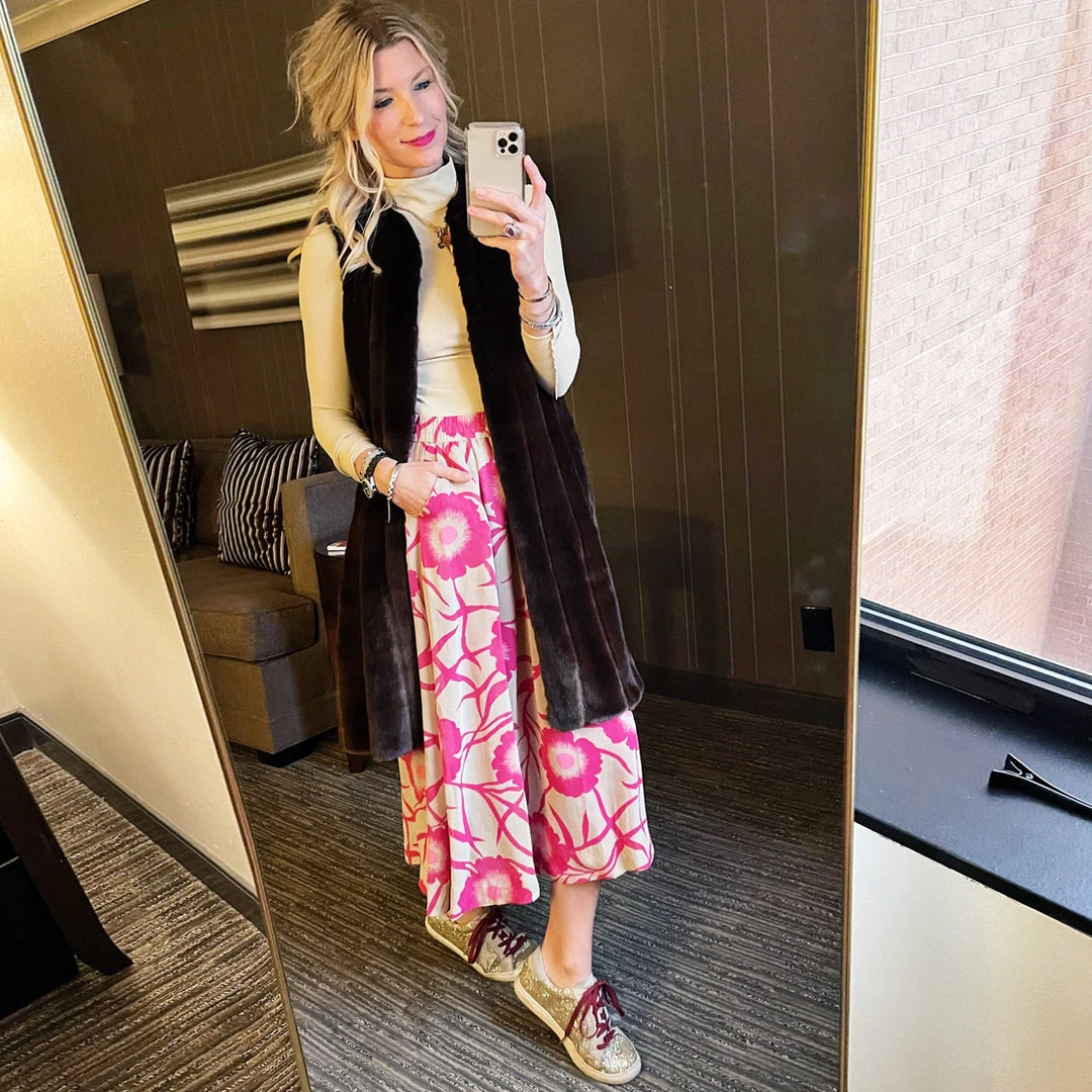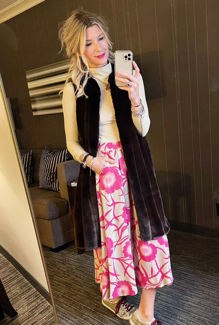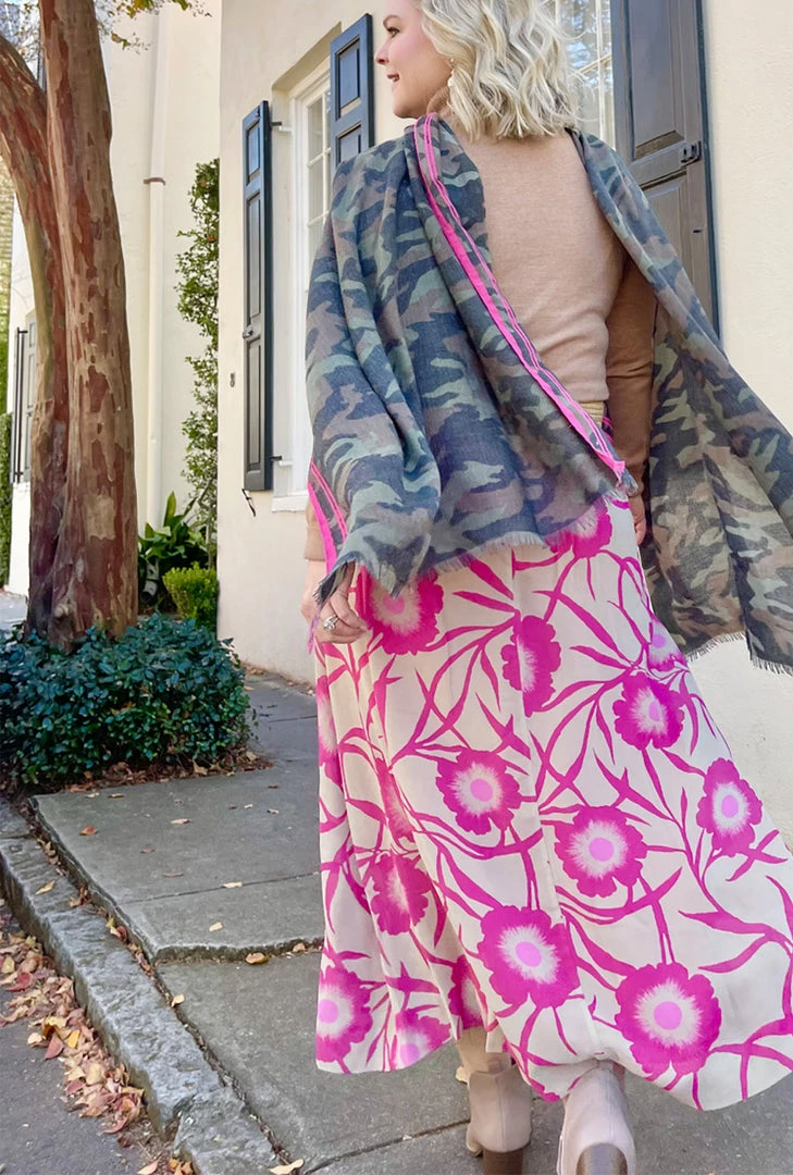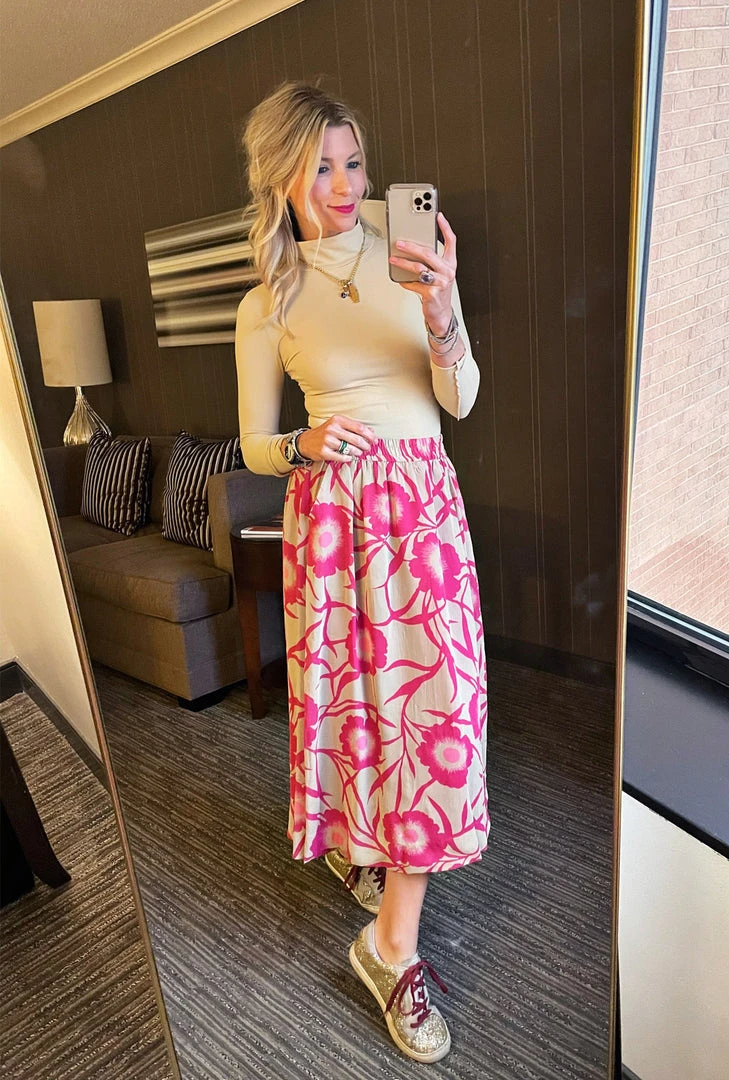 This striking #BURUxJUJU skirt features a bold hot pink floral in a lightweight crepe textile. Fully lined in 100% hot pink cotton with pockets and an elastic waist, she’s as comfortable as she is fun! We love to pair her the matching bow blouse for a “dress” look or focus on her separately with a Beige turtleneck for a more monochromatic vibe.