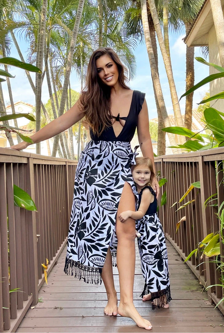Looking for the perfect mommy & me matching moment for your next day spent poolside? This vibrantly patterned, fringed sarong is just the thing. Style it over your favorite swimsuit for a picture perfect moment. A side button holds it perfectly in place, while an elastic waist back and self tie make for an easy fit.
