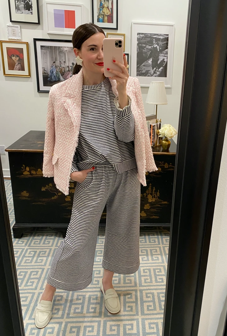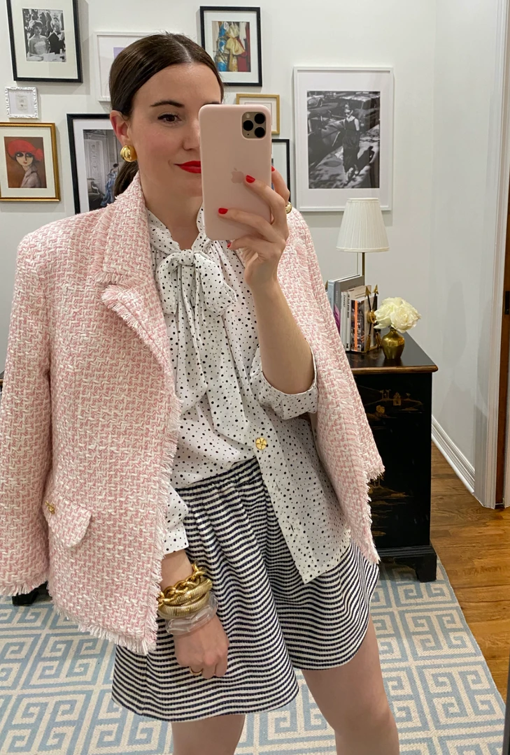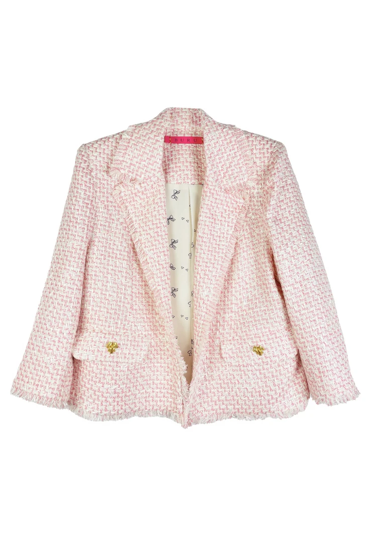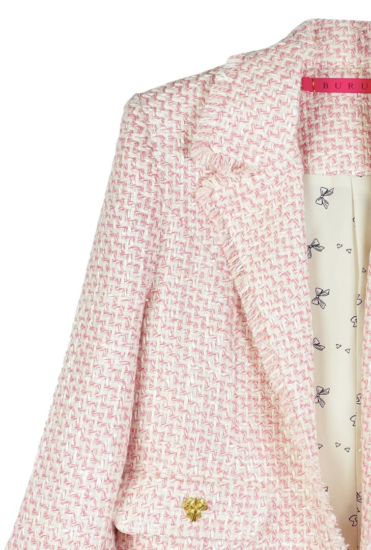 There is really nothing more classic than a tweed blazer. Add in the pink and ivory herringbone for a timeless twist, the incredible vintage bow buttons in a brass finish, and the hand-fringed trim and this happy blazer is the investment piece you’ve been waiting for. Lined with a whimsy black and ivory bow print for a fun contrast, we love this #buruxval piece paired jeans as much as we do with our tossed over our Navy & Ivory Knit Set.