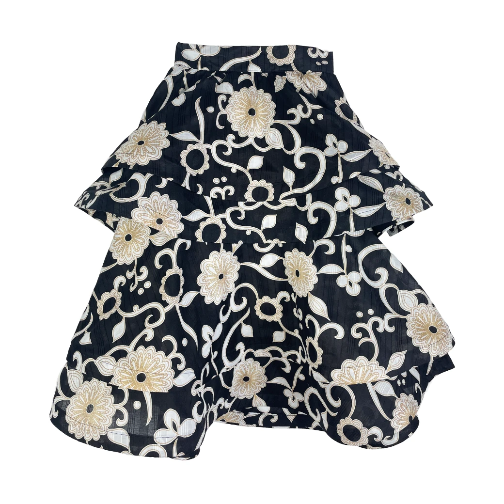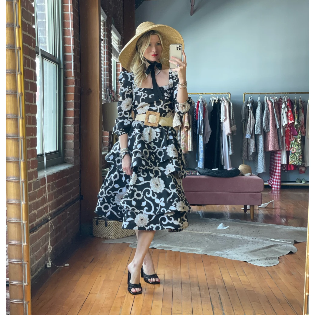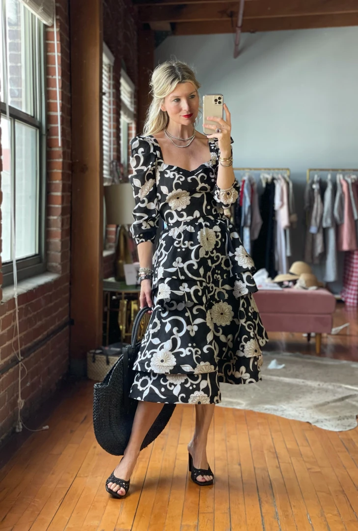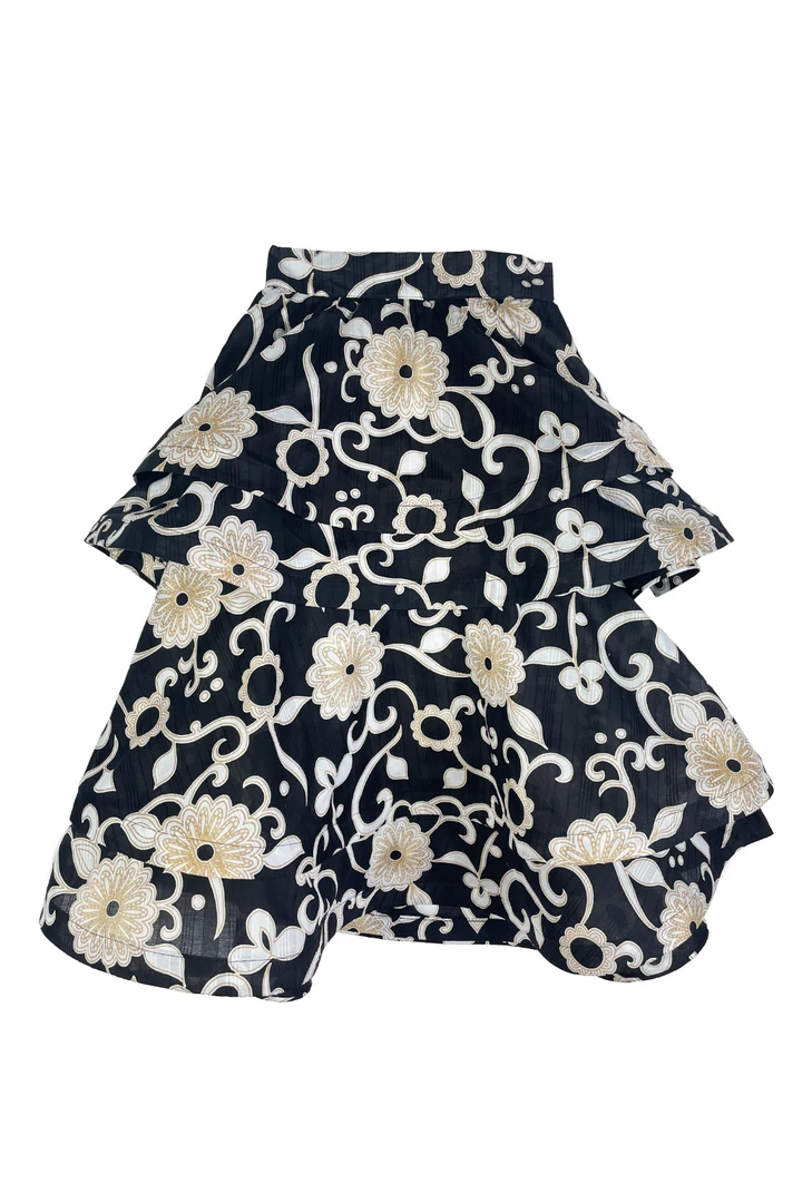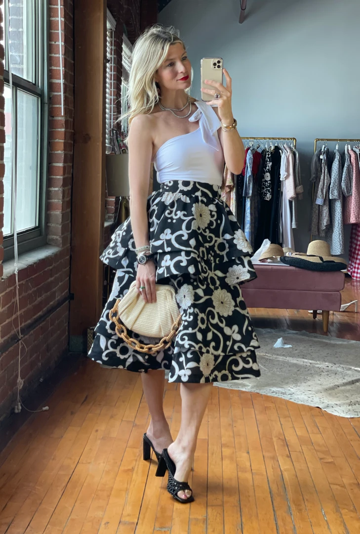 Light and airy, our Ruffled Party Skirt brings all the fun! Created with tiered layers of lightweight, black floral cotton, we love her styled casually with our Puff Sleeve Top in white poplin or elevated with it’s matching Square Neck Top in the same floral for a more “party look”.