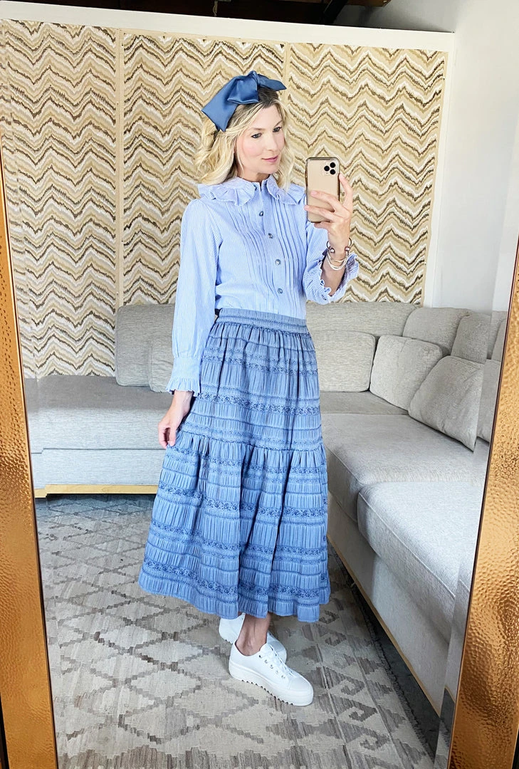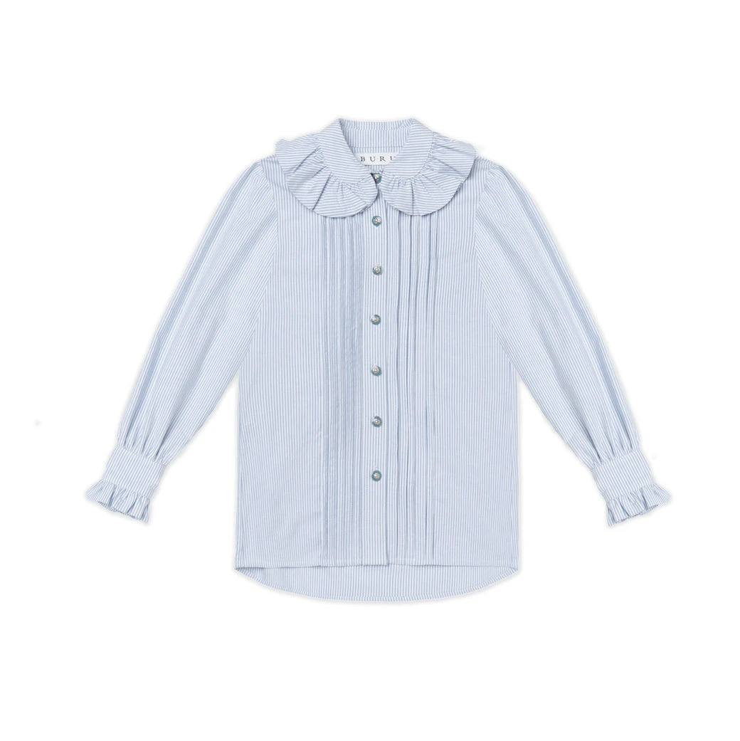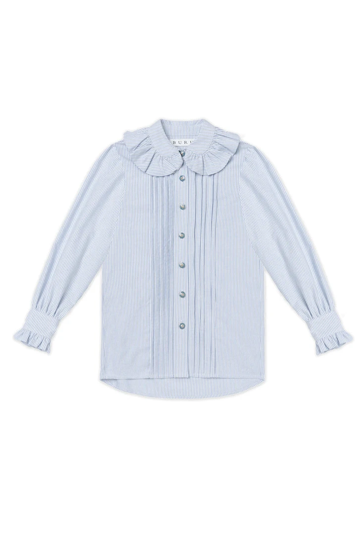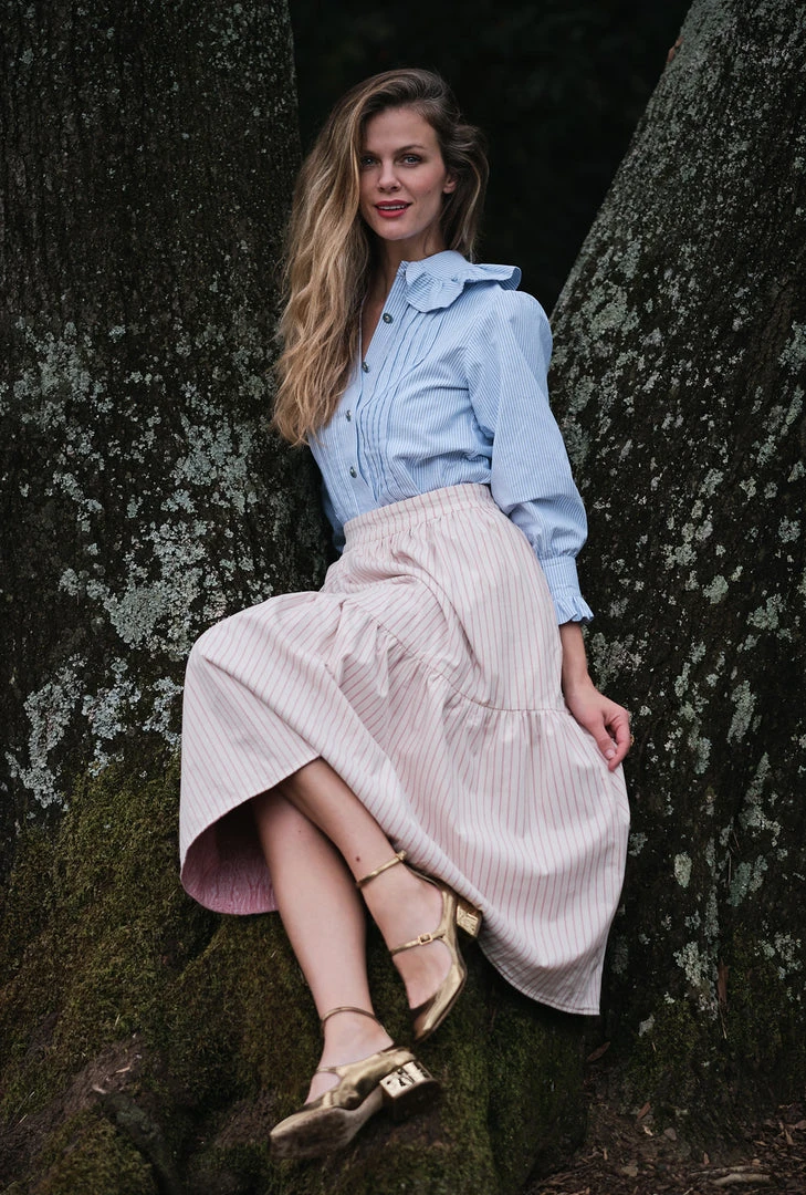 What do you get when you pair pintuck pleats, Oxford pinstripes and the perfect amount of ruffles—the BURU x Brooklyn Blouse! We can’t get enough of this classic blue and white Oxford cloth top with ladylike, granny-core details and the most beautiful blue enameled, lion’s head vintage buttons. Style it with our reversible pink pinstripe tiered skirt for a more girly vibe or throw it on with white cut off jean shorts and sneakers for a busy day around town.