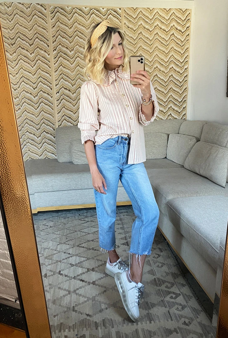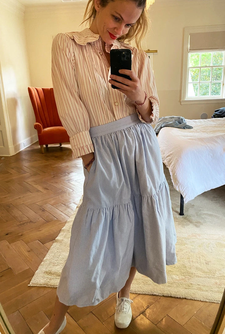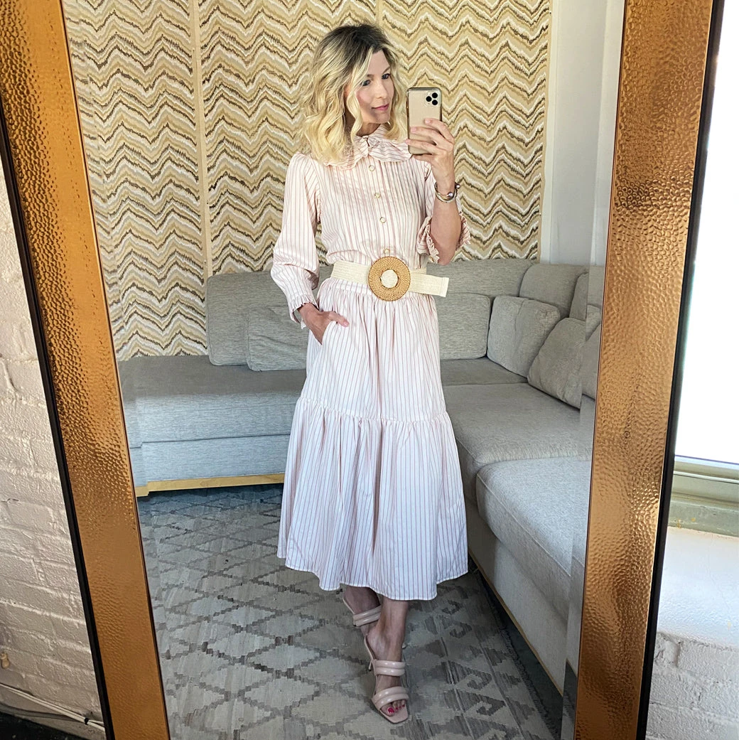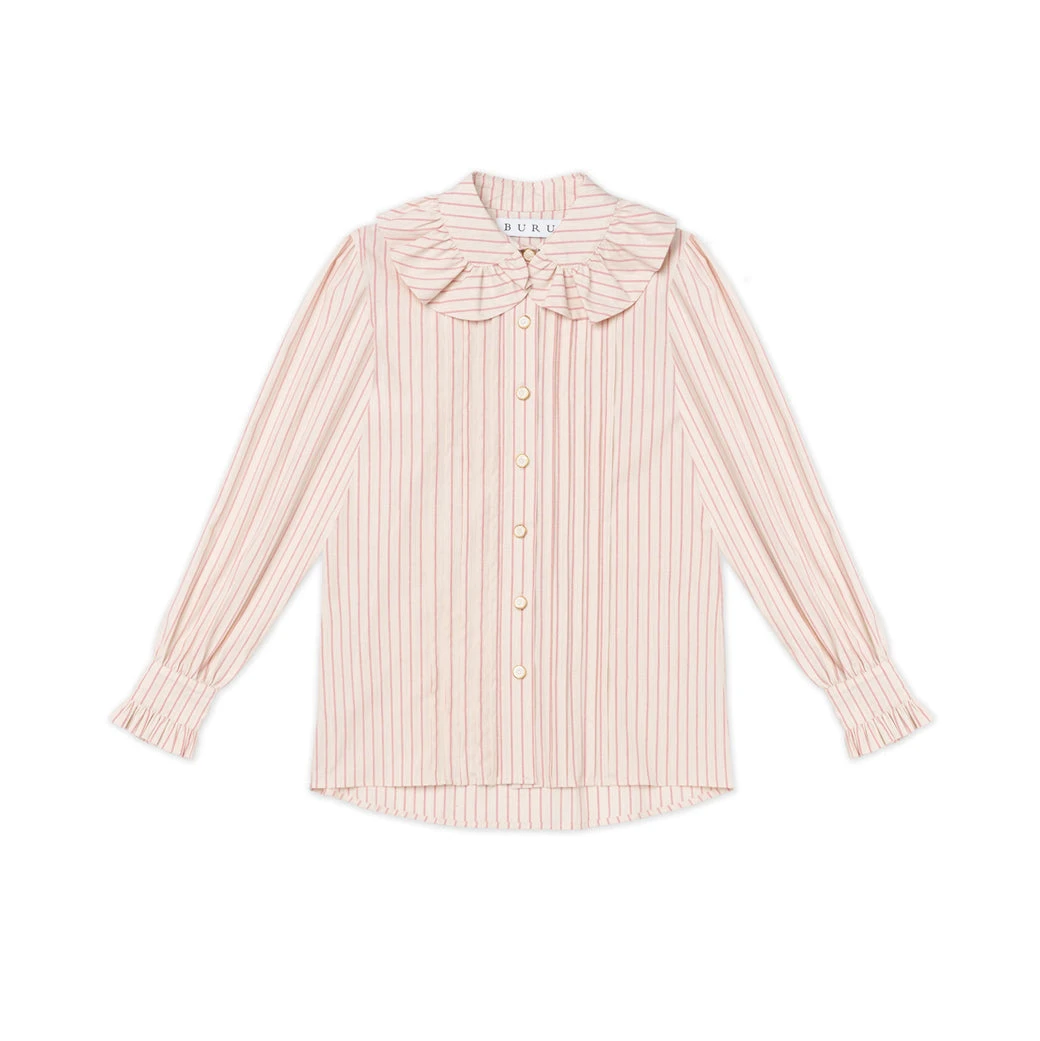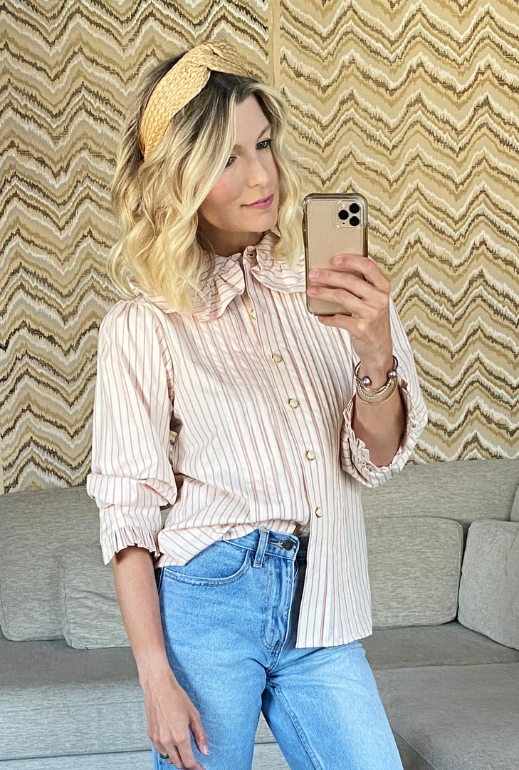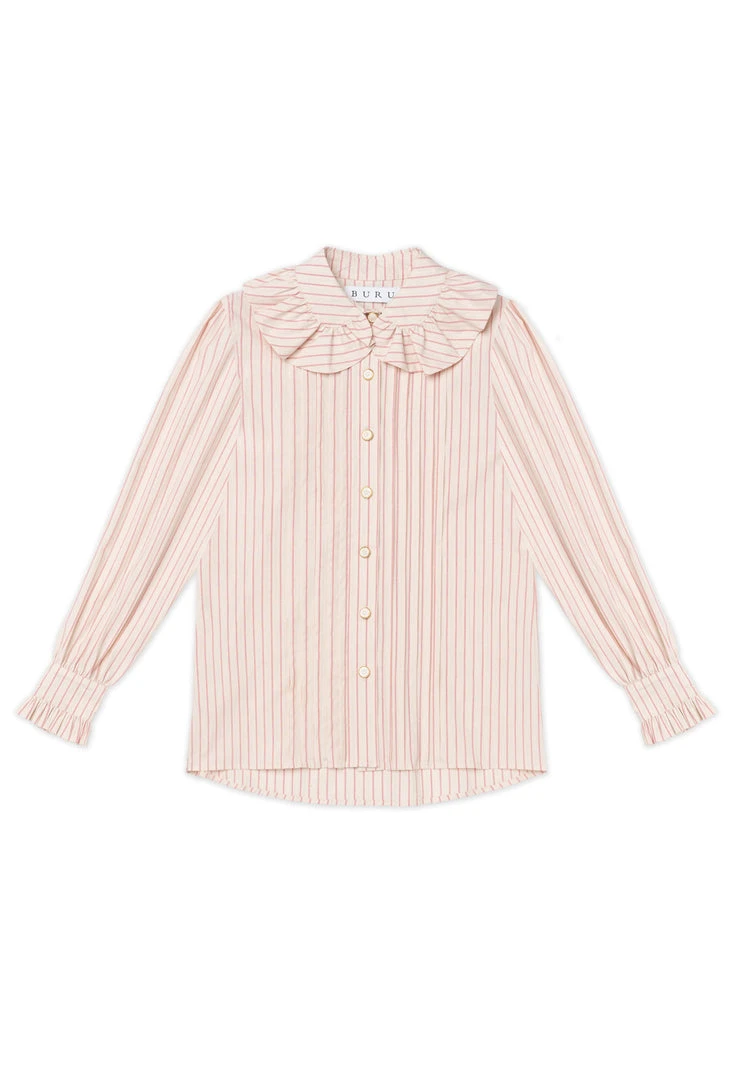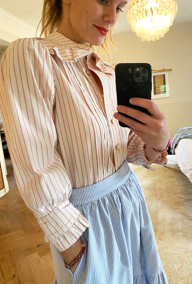 What do you get when you pair pintuck pleats, pink pinstripes and the perfect amount of ruffles—the BURU x Brooklyn Blouse! We can’t get enough of this ladylike, granny-core top in ivory and pink stripes and the beautiful pearlized buttons. Style it with its matching reversible pink pinstripe tiered skirt for a more girly vibe or throw it on with your favorite jeans and sneakers for a busy day around town.