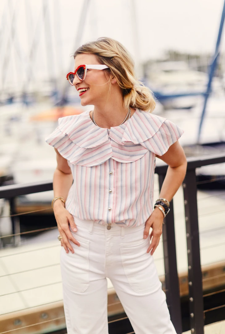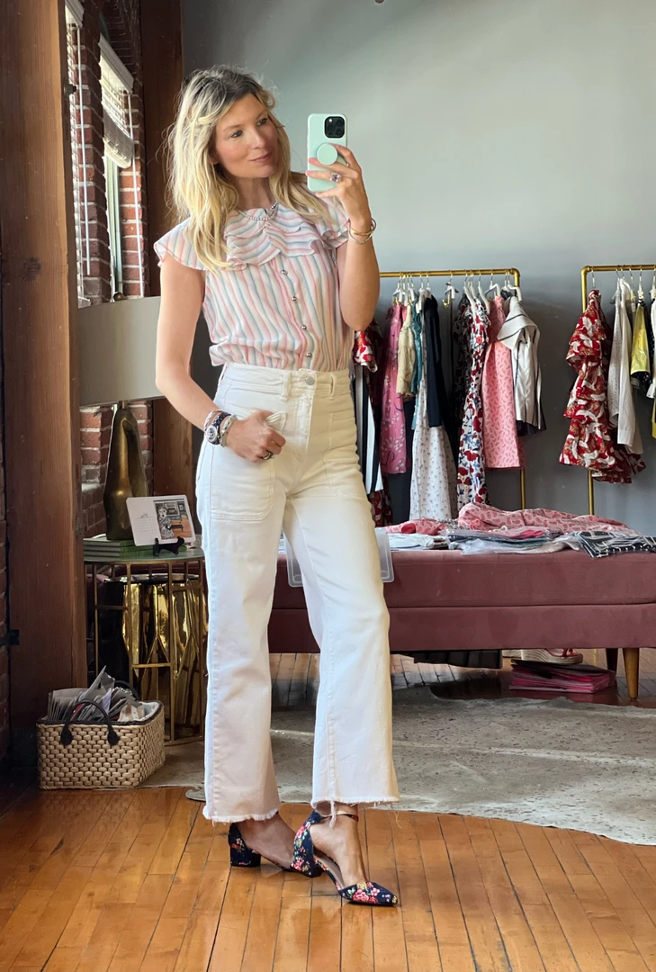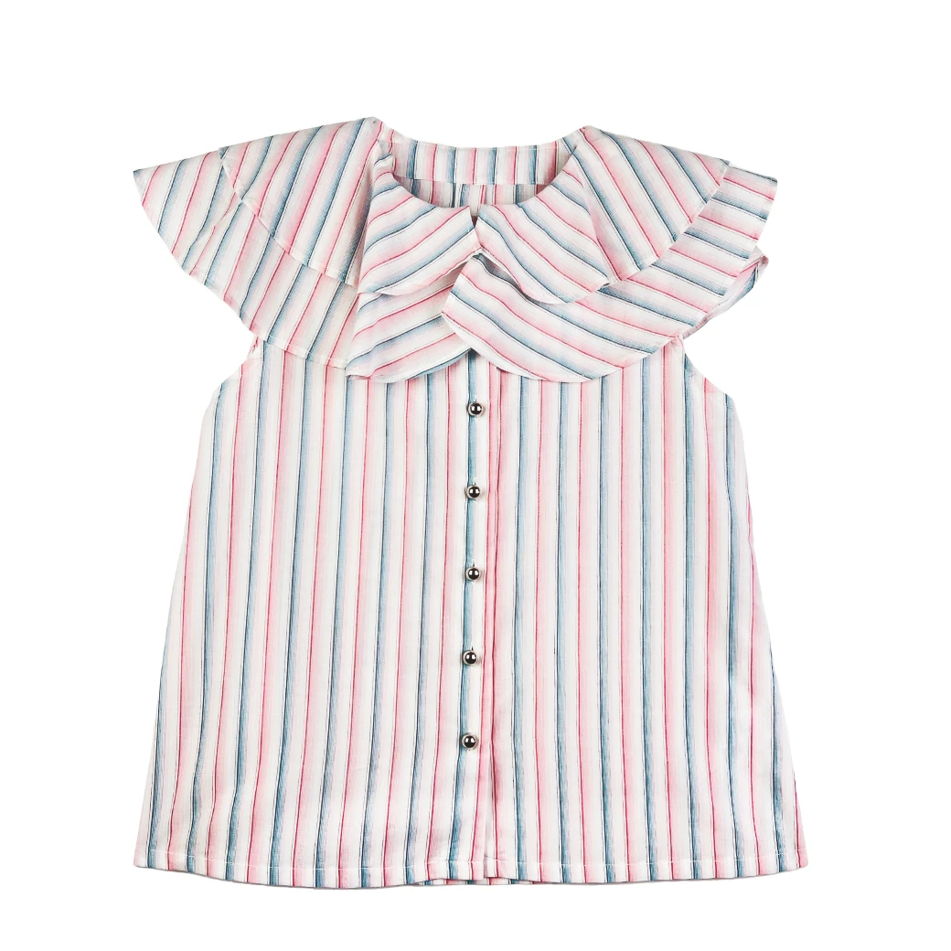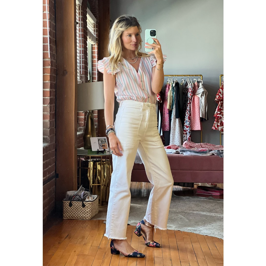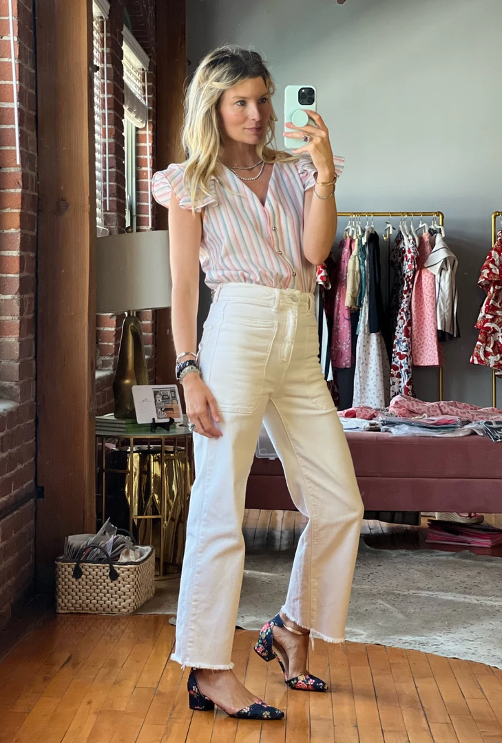 Why have one ruffle…when you can have two? This darling red, white, blue and pink stripe print pairs perfecting with your favorite denim for everyday mom life. We also love her styled up for the 4th of July with our Red Paisley Skirt & Mod Top Set. Super lightweight cotton and ideal for hot summer days.