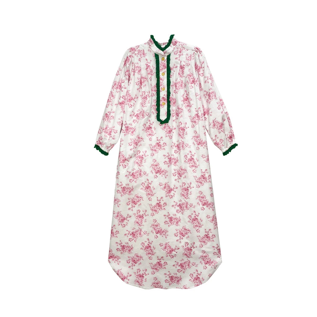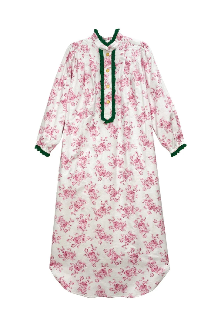 Create the most magical holiday moment at home with our Respite Gown and its matching mommy and me MINI Housecoat. Made of soft, vintage rose print cotton flannel, trimmed in dark green with gold buttons—this elevated nightgown is sure to become a treasured piece that you wear for holidays to come.