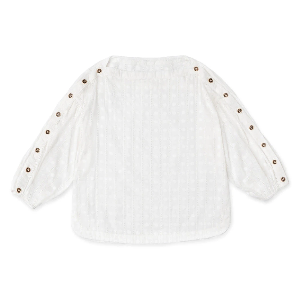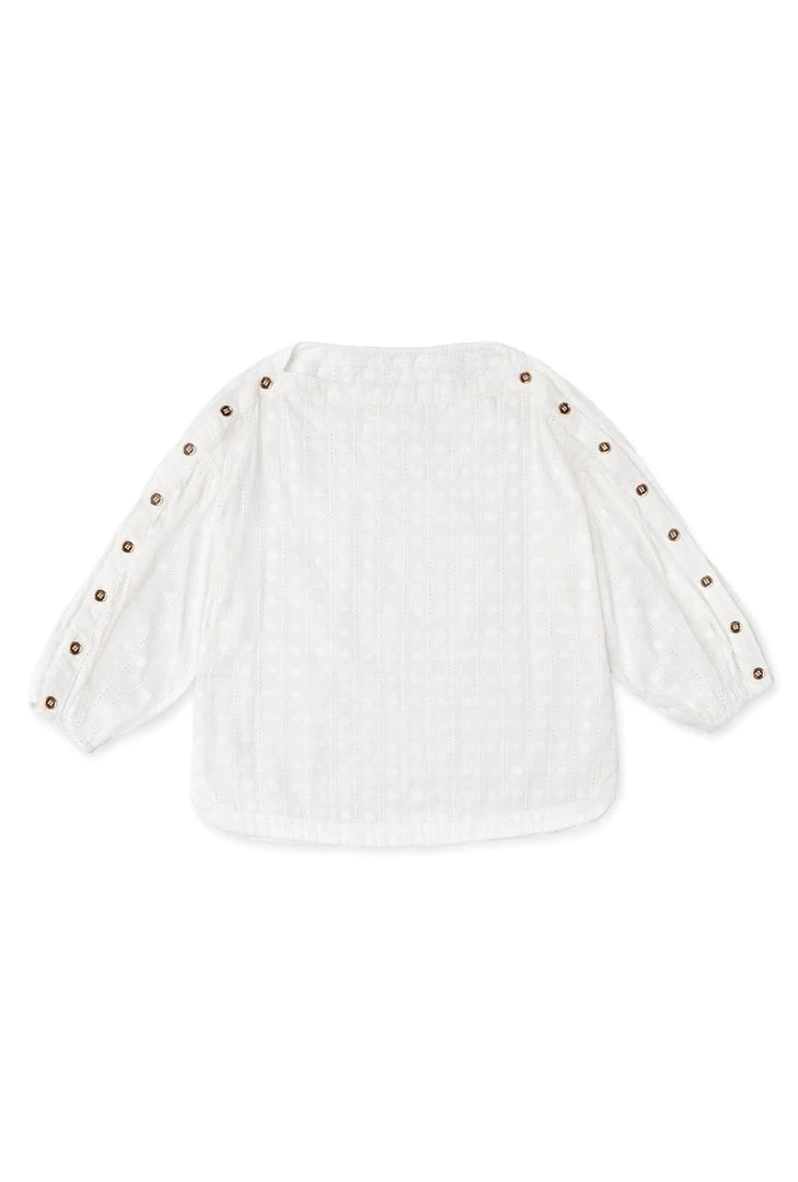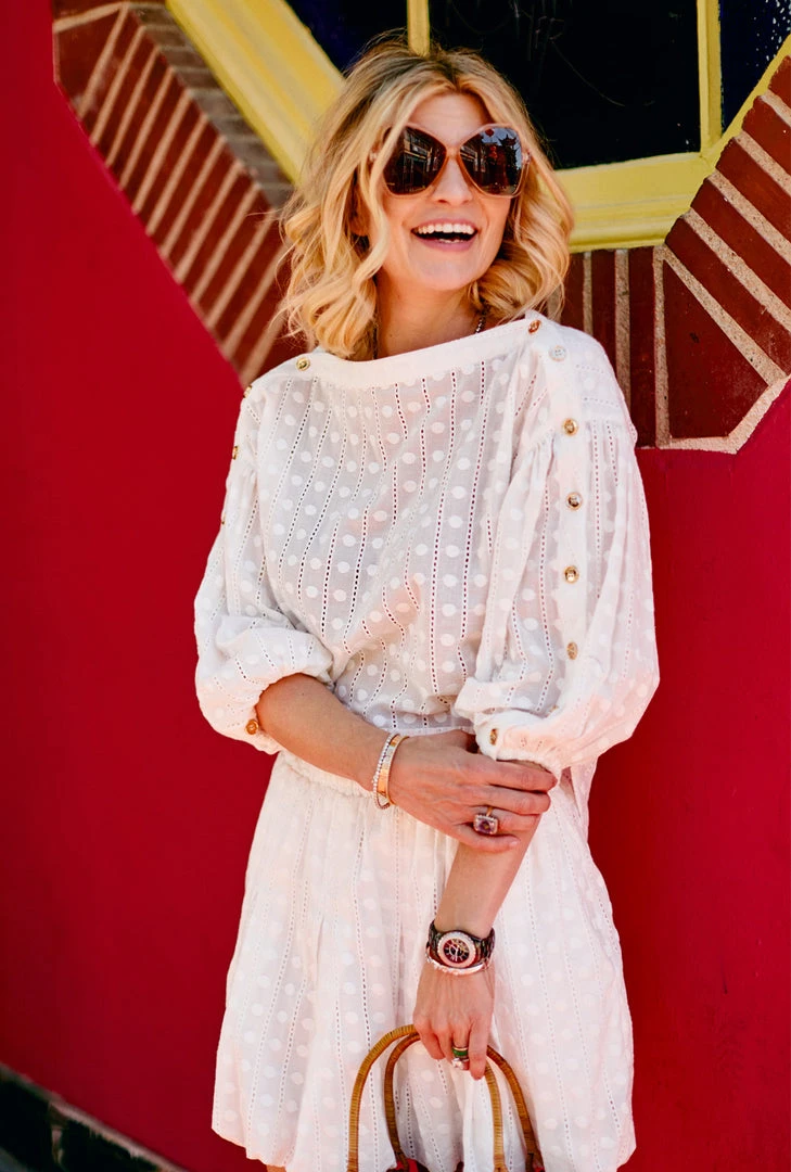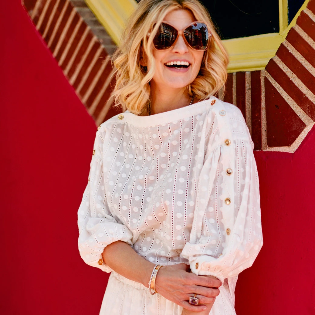 Can a mama every have too many white tops? We think not, and we are absolutely head over heels in love with this silhouette. Featuring buttons down both sleeves, allowing for countless style options + easy access to nurse if needed—it’s easily dressed up or down for any occasion, from grocery store runs to Saturday mornings on the soccer field to dance recitals. We love this cotton white eyelet fabric. Don’t miss the matching skirt!