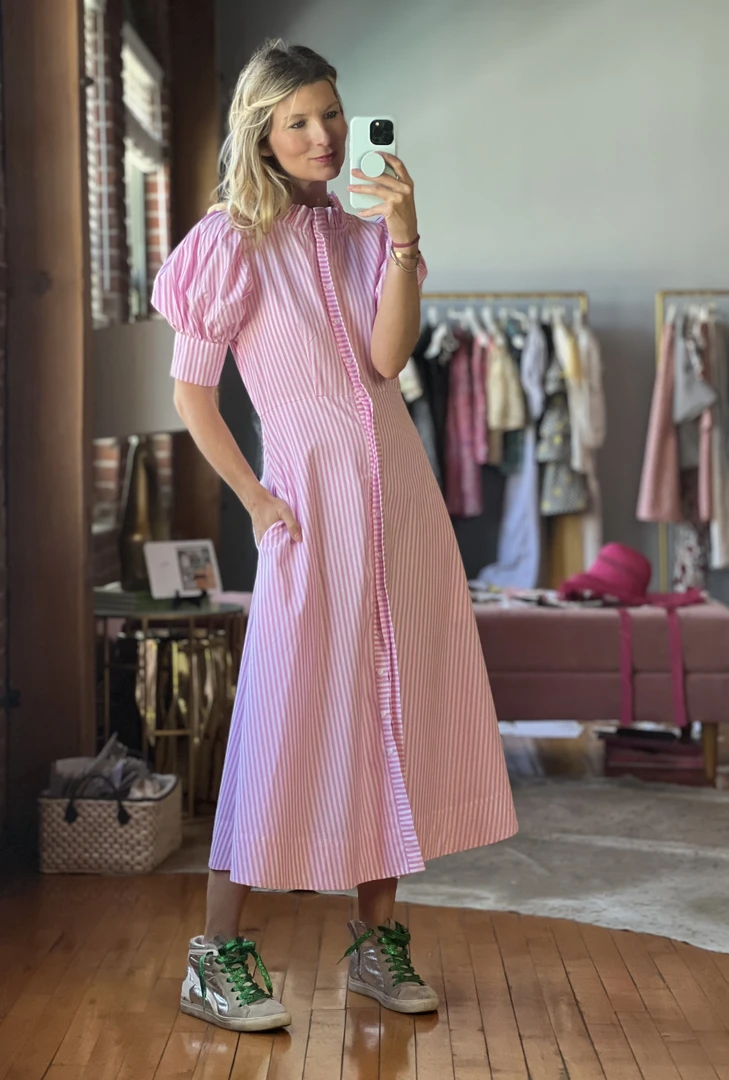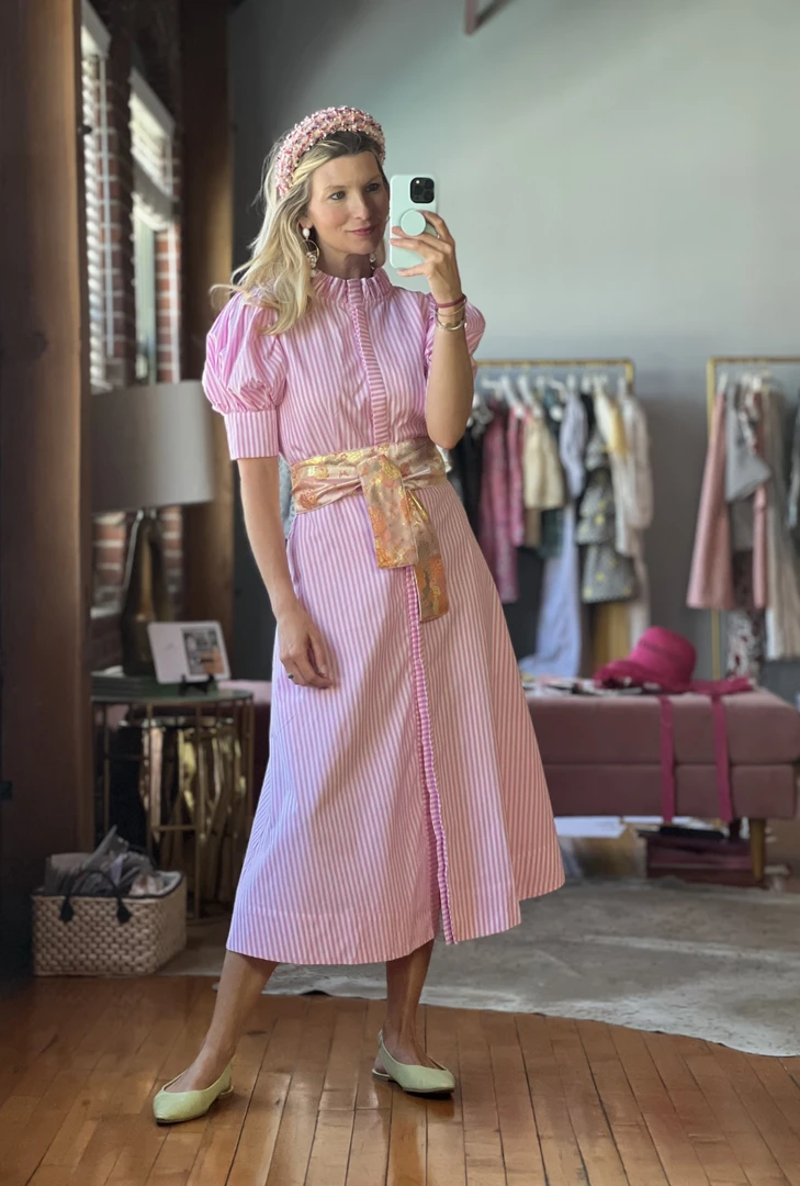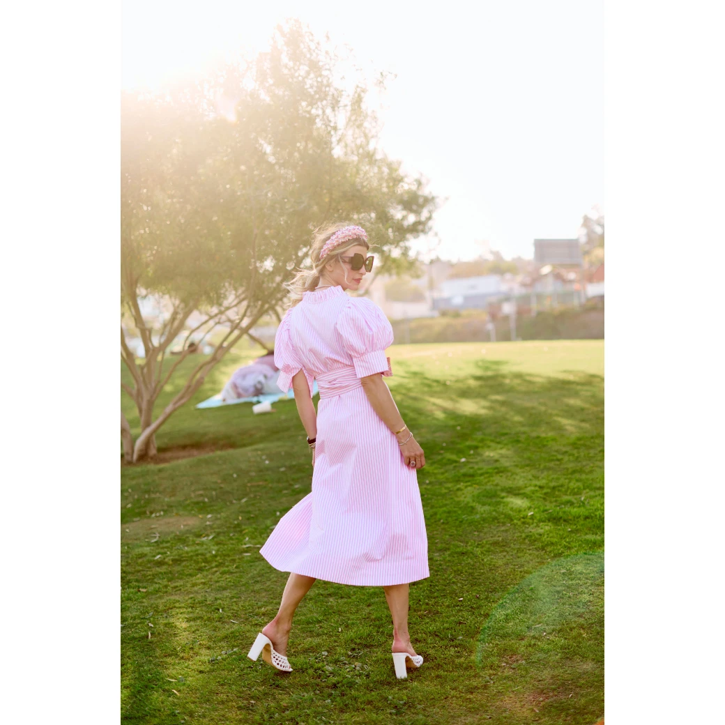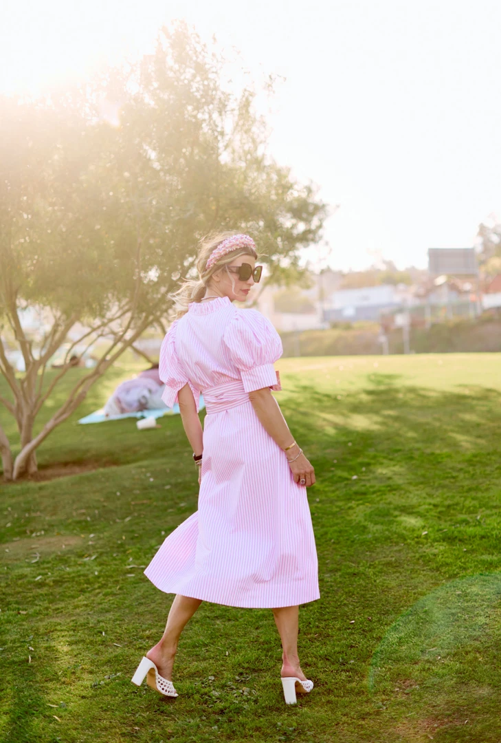 Day dresses are our secret weapon to getting out the the door quickly while looking far more polished than time allows! This classic pink and white stripe is ideal for dinner under the stars, sunset boat cruises and strolls by the sea. OR everyday mom life…whatever life throws at you!