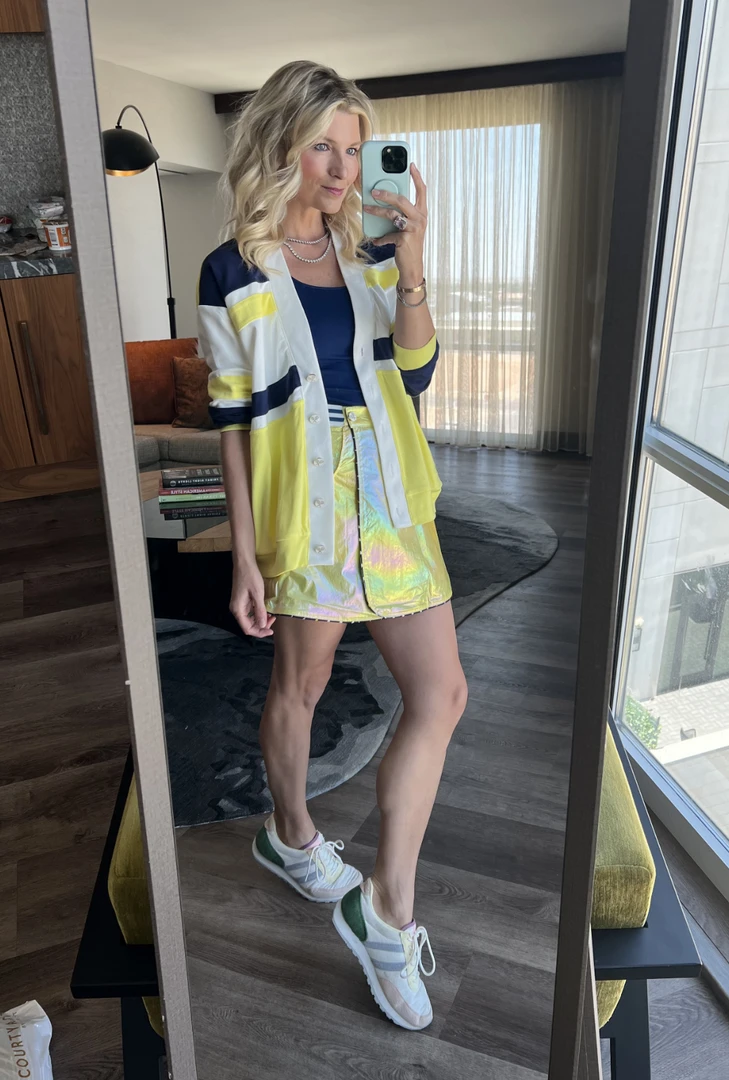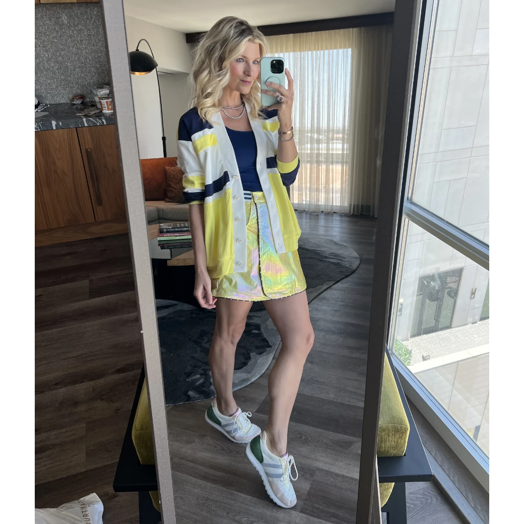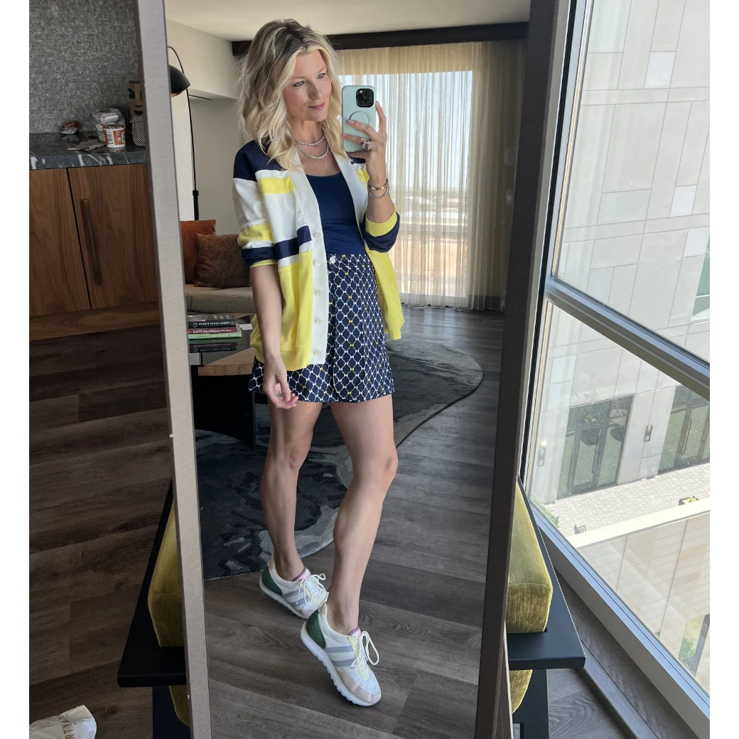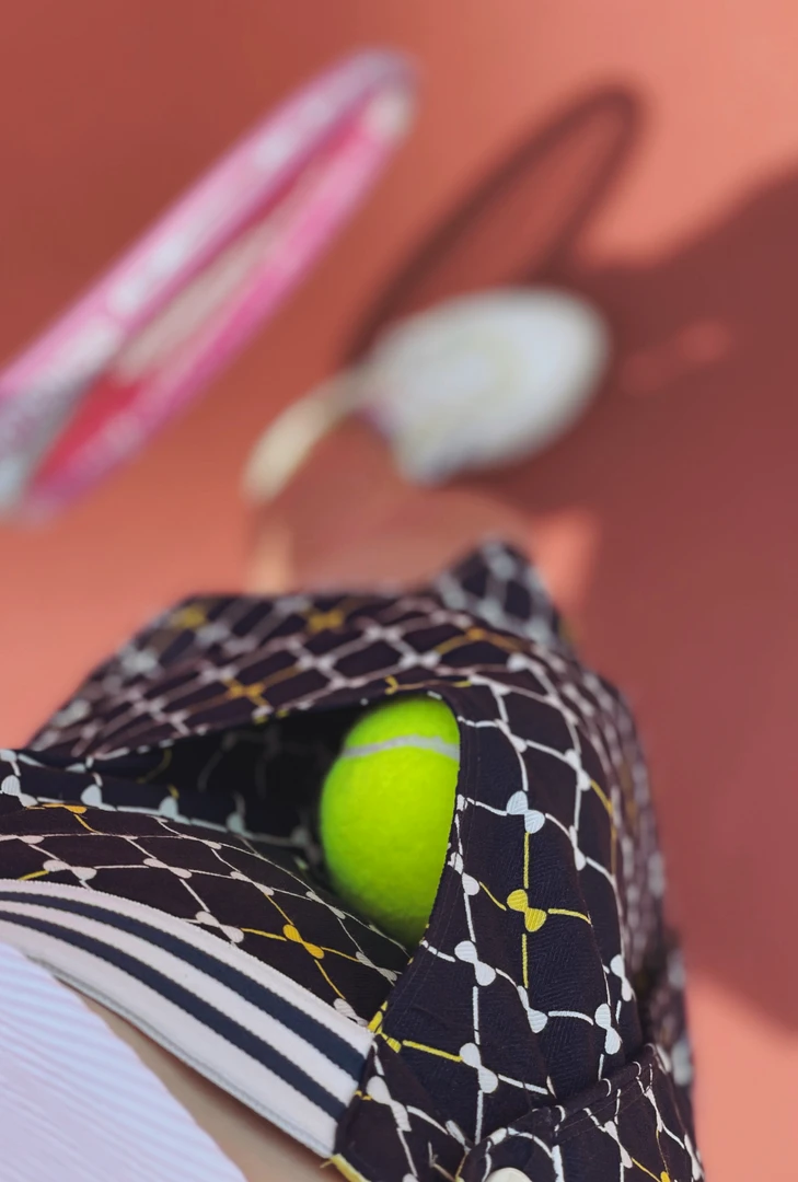 If there is anything better than a cute tennis skirt, then it’s a Reversible CUTE Tennis skirt avec 2 looks in one! On one side, you have a whimsy bow print in navy, white and yellow to pair perfectly with its coordinating Cropped Peter Pan Tee, and on the other you have a cool, yellow lurex that looks incredible with our White Tennis Tank + Tennis Cardigan. *Runs slightly larger than the Classic Pleated Tennis Skirt and sits slightly lower on the waist.