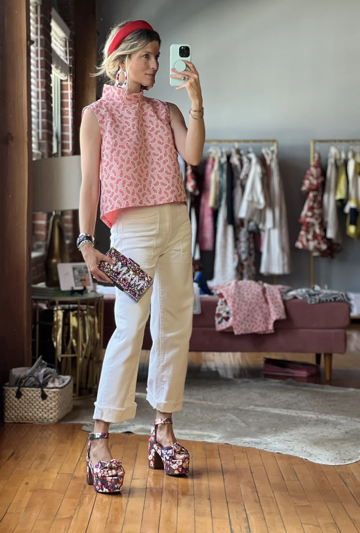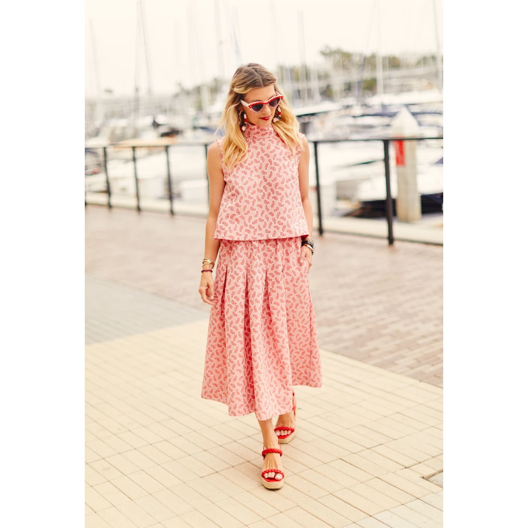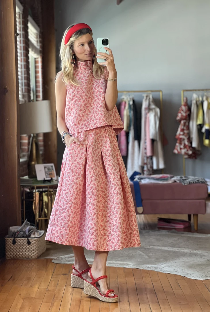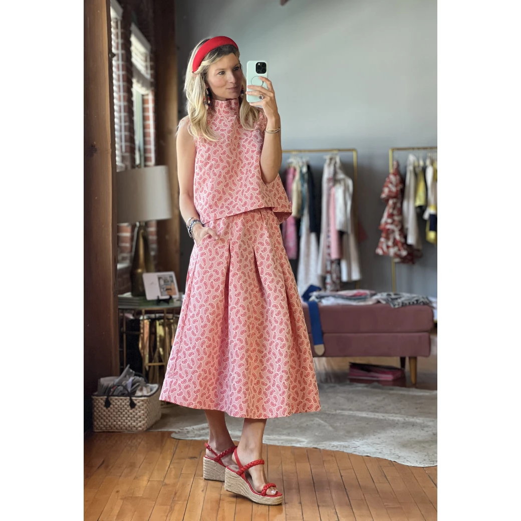 A fresh take on our sleeveless Mod Top—our new cropped version is perfect for pairing with its matching skirt and your favorite high rise denim. The year-round weight Paisley textile is ideal for transitioning through the seasons. Style it for a festive Fourth of July with some blue and white accessories or dress it up for the holidays with a little green and some sparkles.