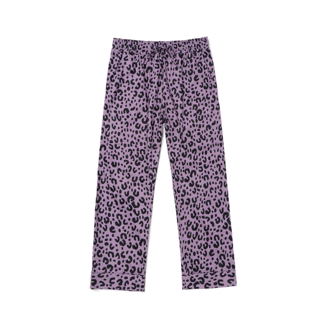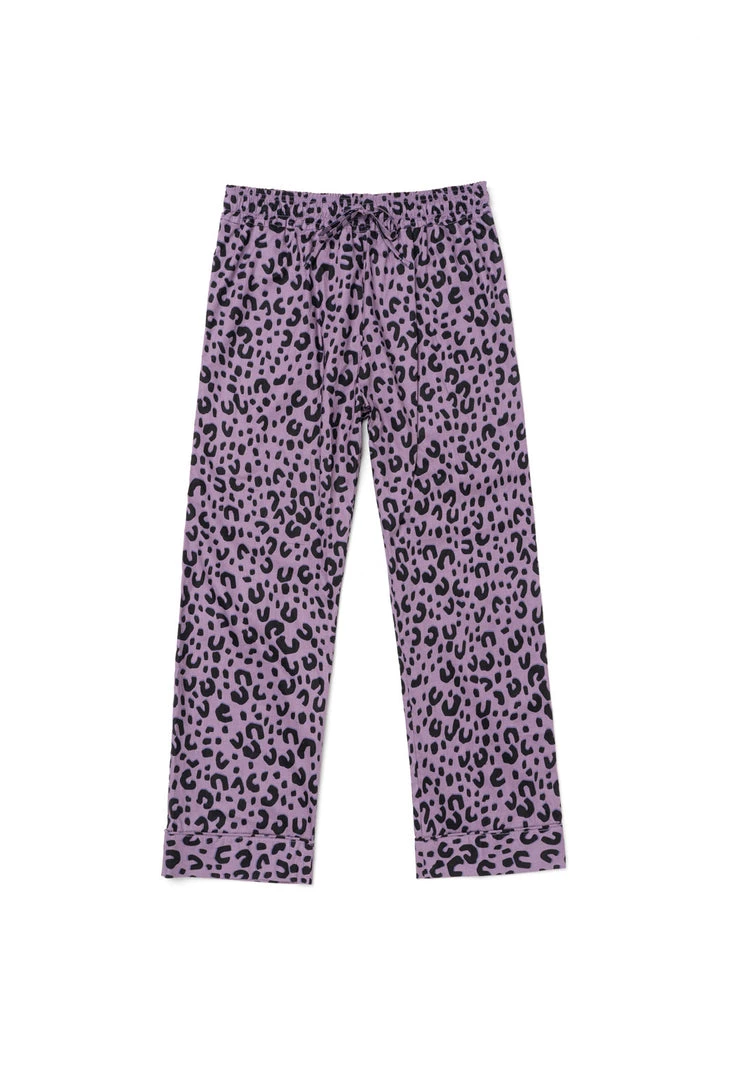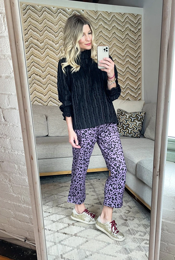 Pretty in purple. Go wild with our purple cheetah print. With a drawstring elastic waist and pockets, we based the fit of these pants on our PJ Trousers. Cropped at the ankle with self-piping detail and a hemline band. Pair them with the matching Peplum Button Down for a vibrant look; or keep it more classic with a black turtleneck or our black fringe Mod Top.