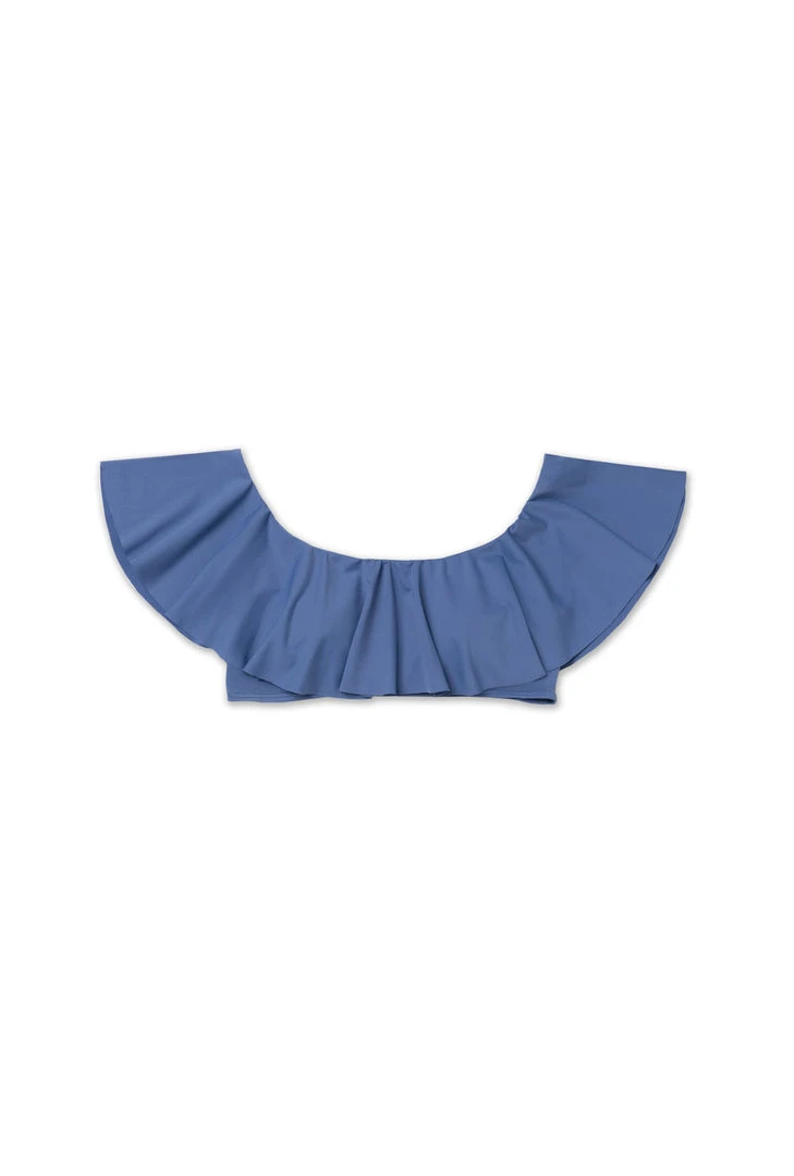 Whether you wear it on the shoulder while chasing after little ones at the pool or off the shoulder while enjoying a good book on a beach lounger, this beautiful blue swim top, with an elegant ruffle is a sunwear staple. We love it paired with its matching, high-rise swim bottoms.