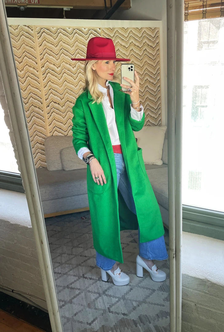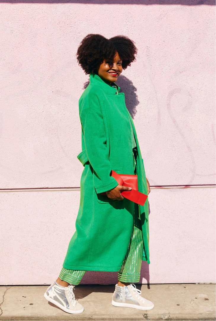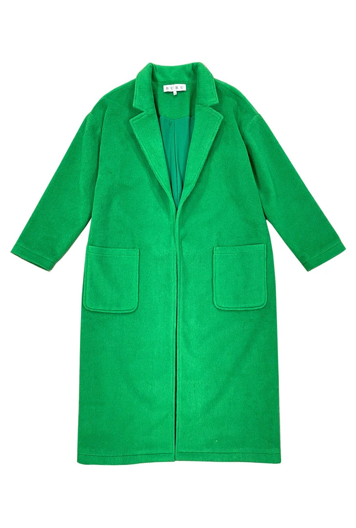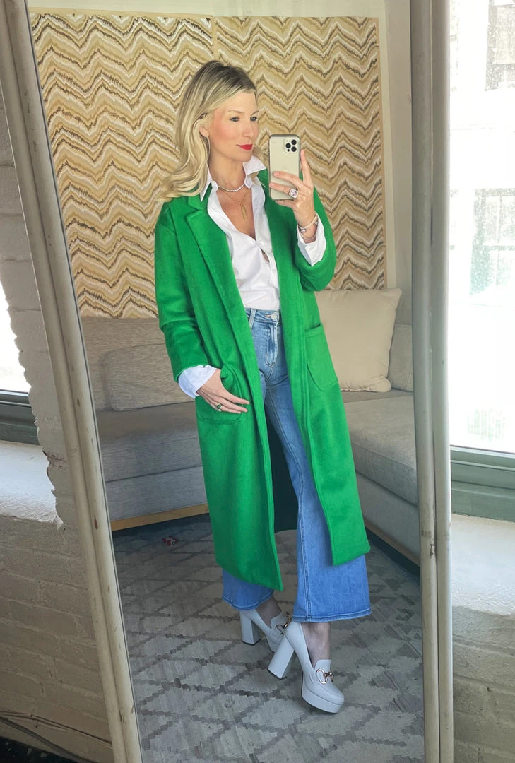 Why wear a black or camel coat when green is on the table? Though she may be made of Faux Mo(hair), we feel strongly that you will not have FOMO when wearing this bold beauty. With an open front and a beautiful back belt detail, this easy throw on and go Car Coat adds a pep to your step. Style her with pieces from our green and silver collection for a fun holiday look or keep it simple with jeans and a classic white button down.