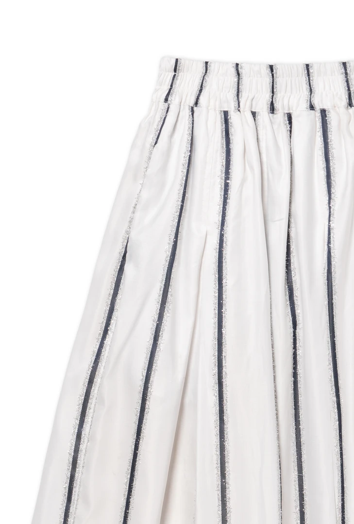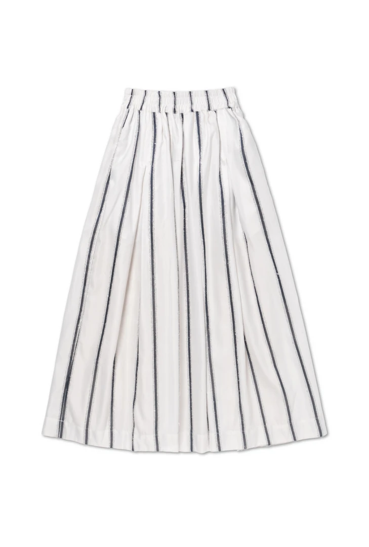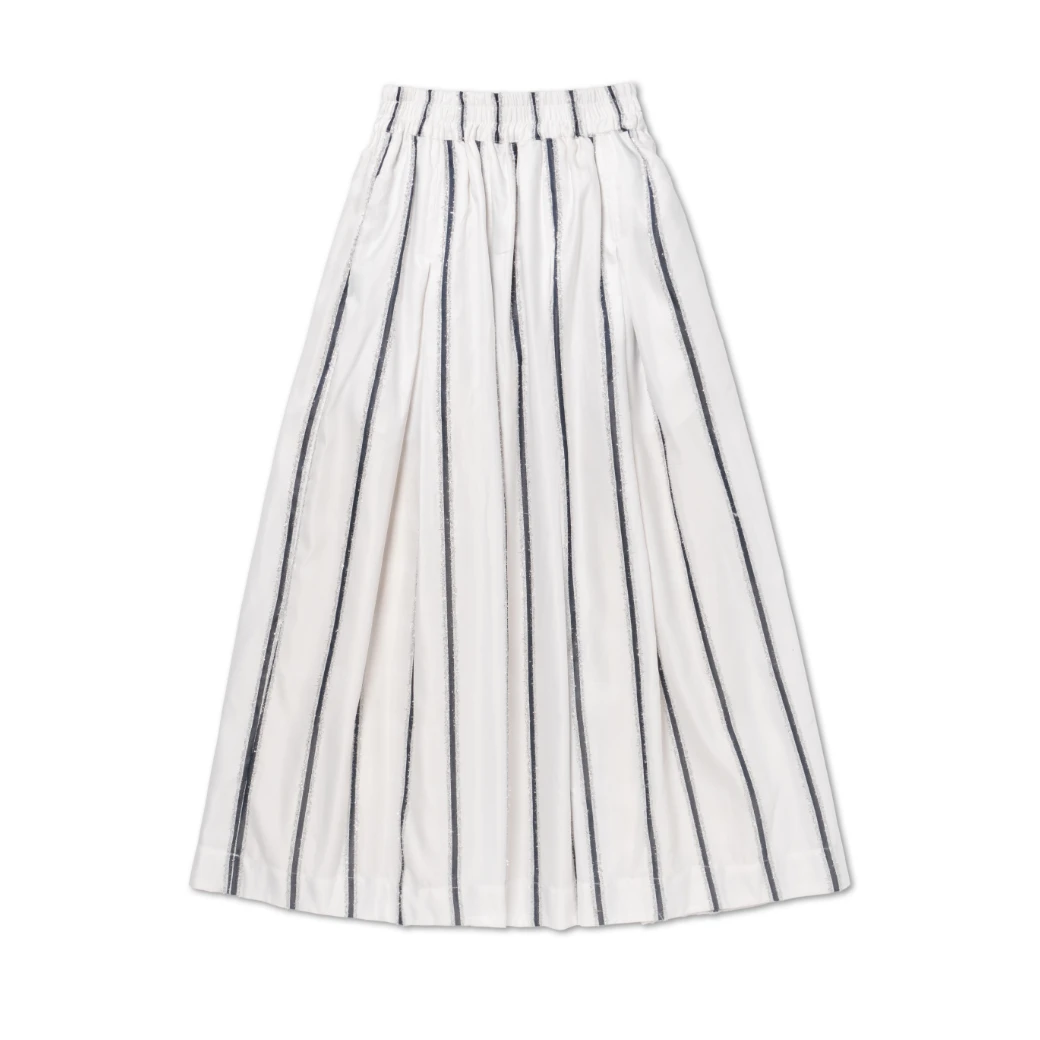 If you’ve been on the hunt for a maxi skirt that literally sparkles, then look no further, mama. This elastic waist skirt in white, navy blue and silver tinsel stripe is what Fancy 4th of July dreams are made of! Style her with our Navy & Silver bow blouse and matching Cropped Car Coat for an over the top look OR go simple with a tank and flat sandals.