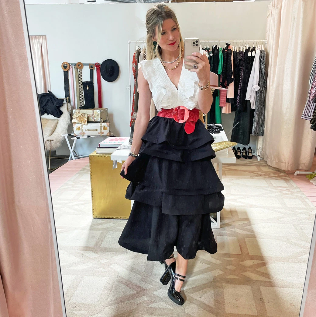 Be the belle of the ball in updated Teagan Skirt—now in a MIDI length. She may be shorter, but of course she still has an elastic waist in the back and she’s still washable! Each layer is banded under the hem with a strong net tulle to give it its bold, dramatic shape. Style it with a simple tee or go BIG with a colorful blouse.