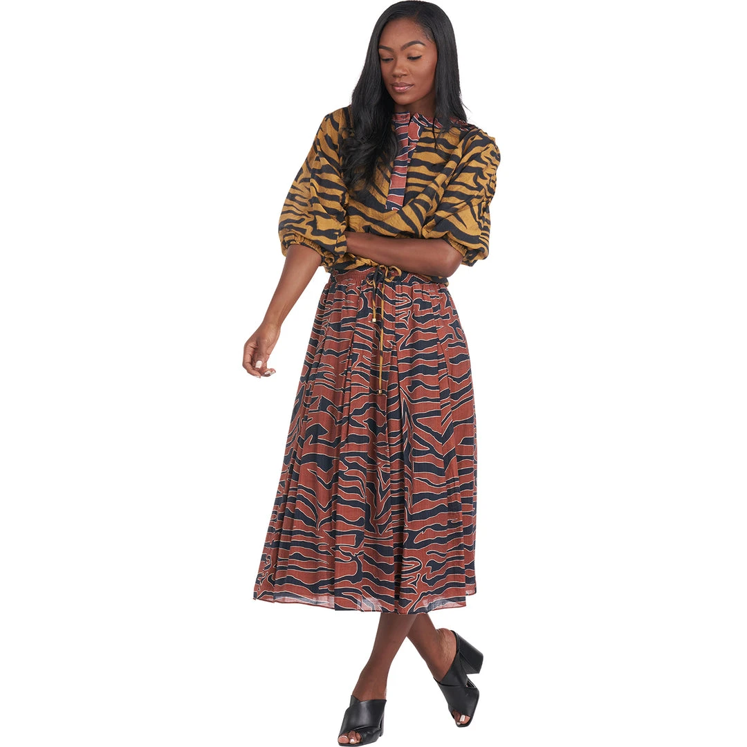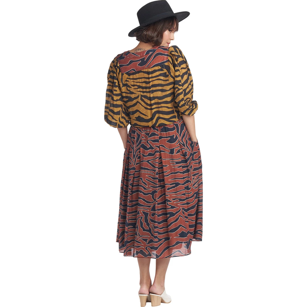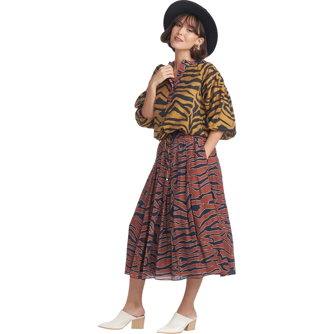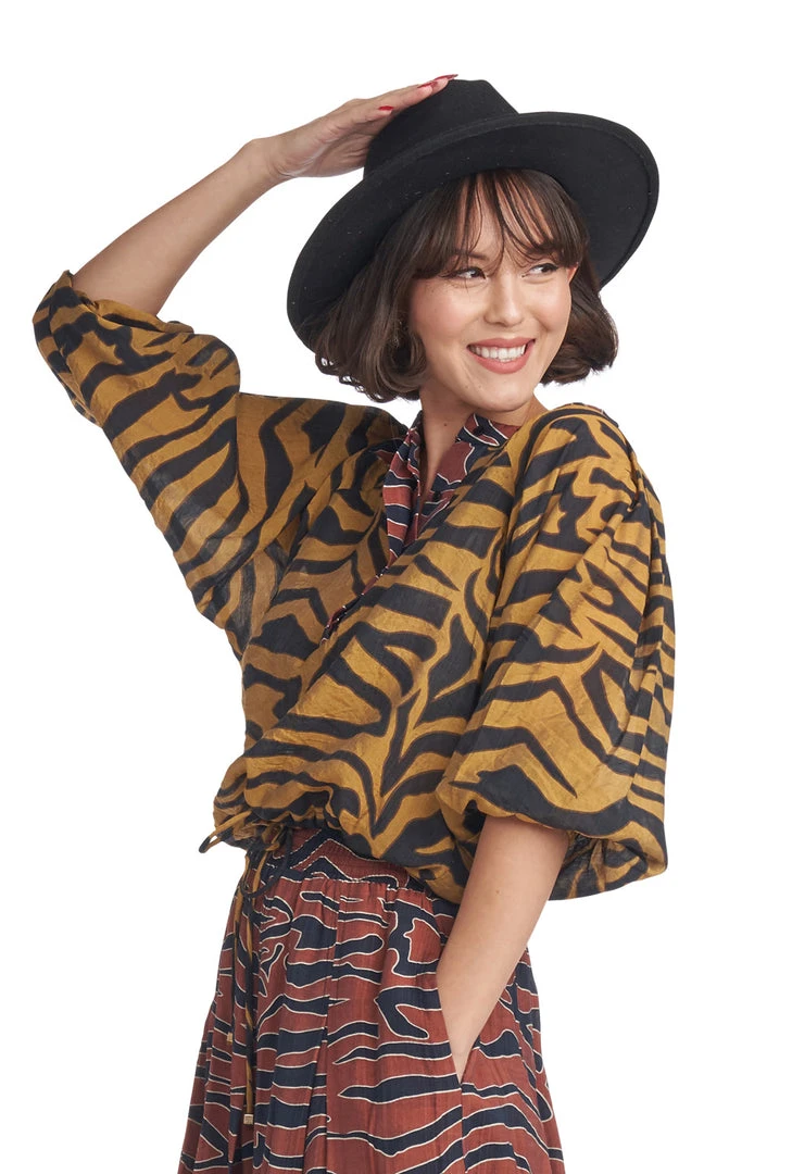 We started with a simple question. What are the greatest attributes of a top? Lightweight, flowy material. Check. Transitional, chic print. Check. Relaxed sleeves with an elastic cuff so that they always stay right where you want them. Check. Drawstring hem so that you can have the perfectly bloused look. Check Mate. And voila! Here she is, in a brand new print! Pair it with the contrasting smocked skirt for the perfect look.