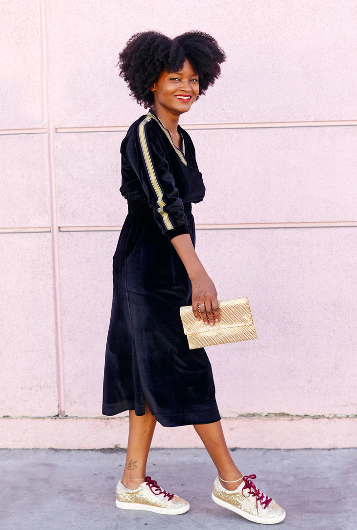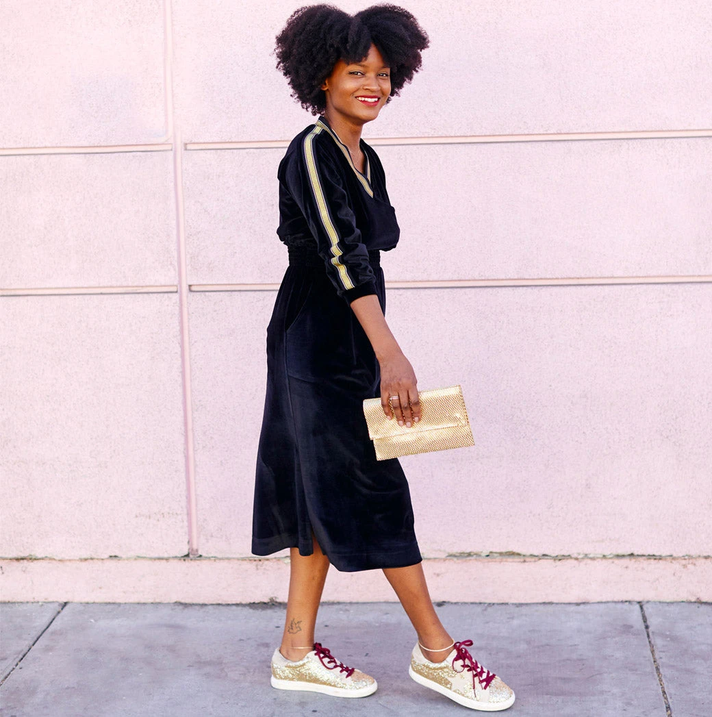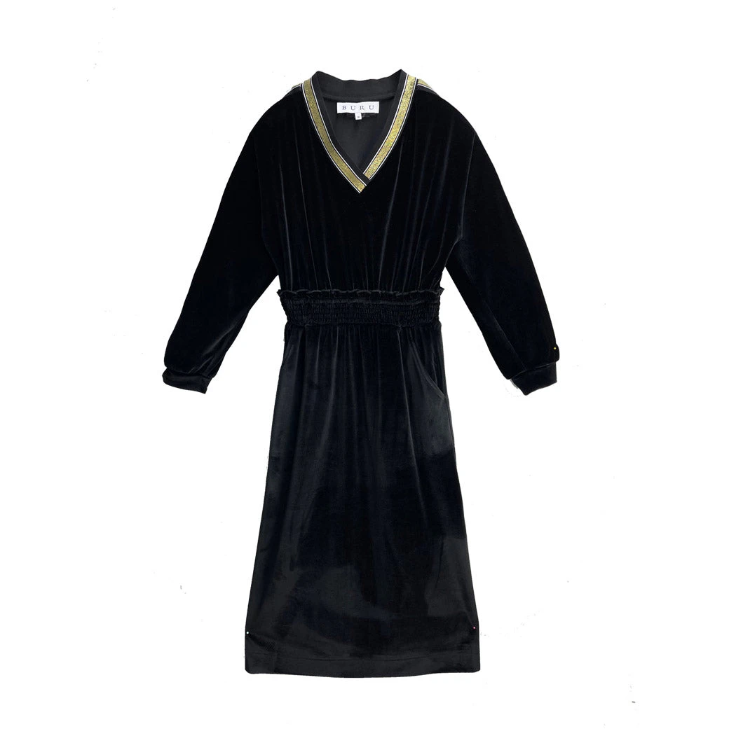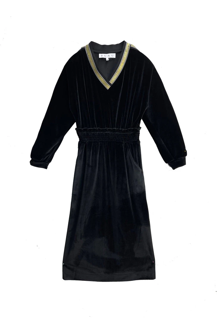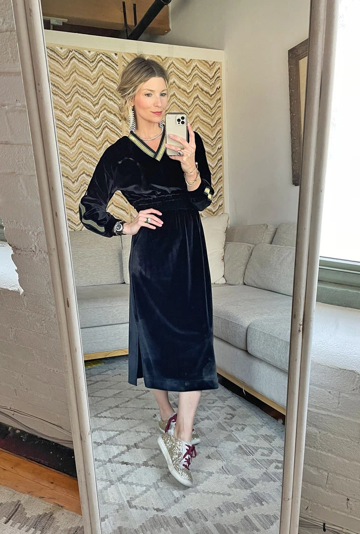 It’s hard to put into words just how dreamy this dress is in person. Buttery soft, black velour with gold trim around the neck and down the sleeves, our Track Dress was inspired by the 1980’s “activewear”. Why wear a track suit when you can wear a track dress, right? Dress her up with heels for a night out or toss on your favorite sneakers and hit the ground running on a busy school day.