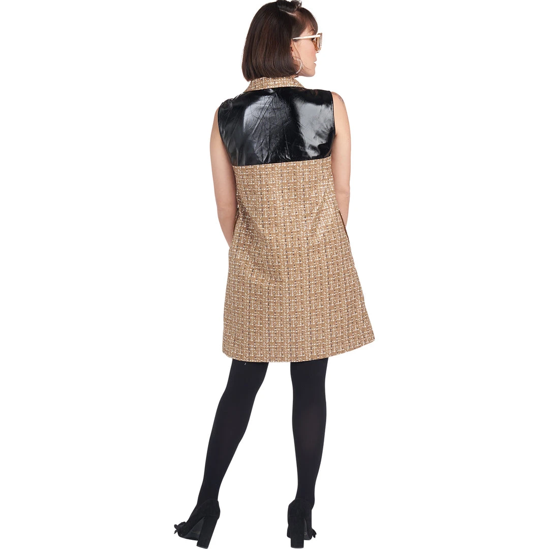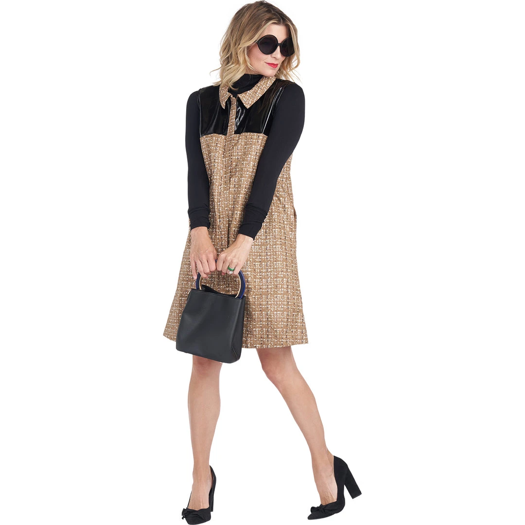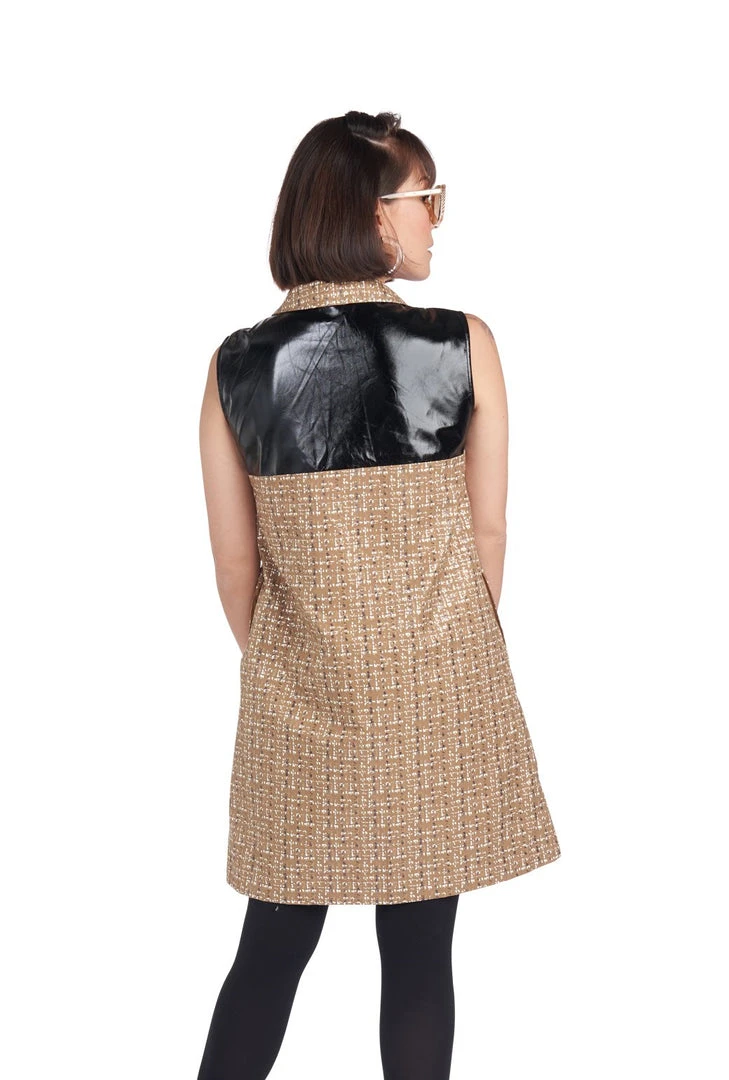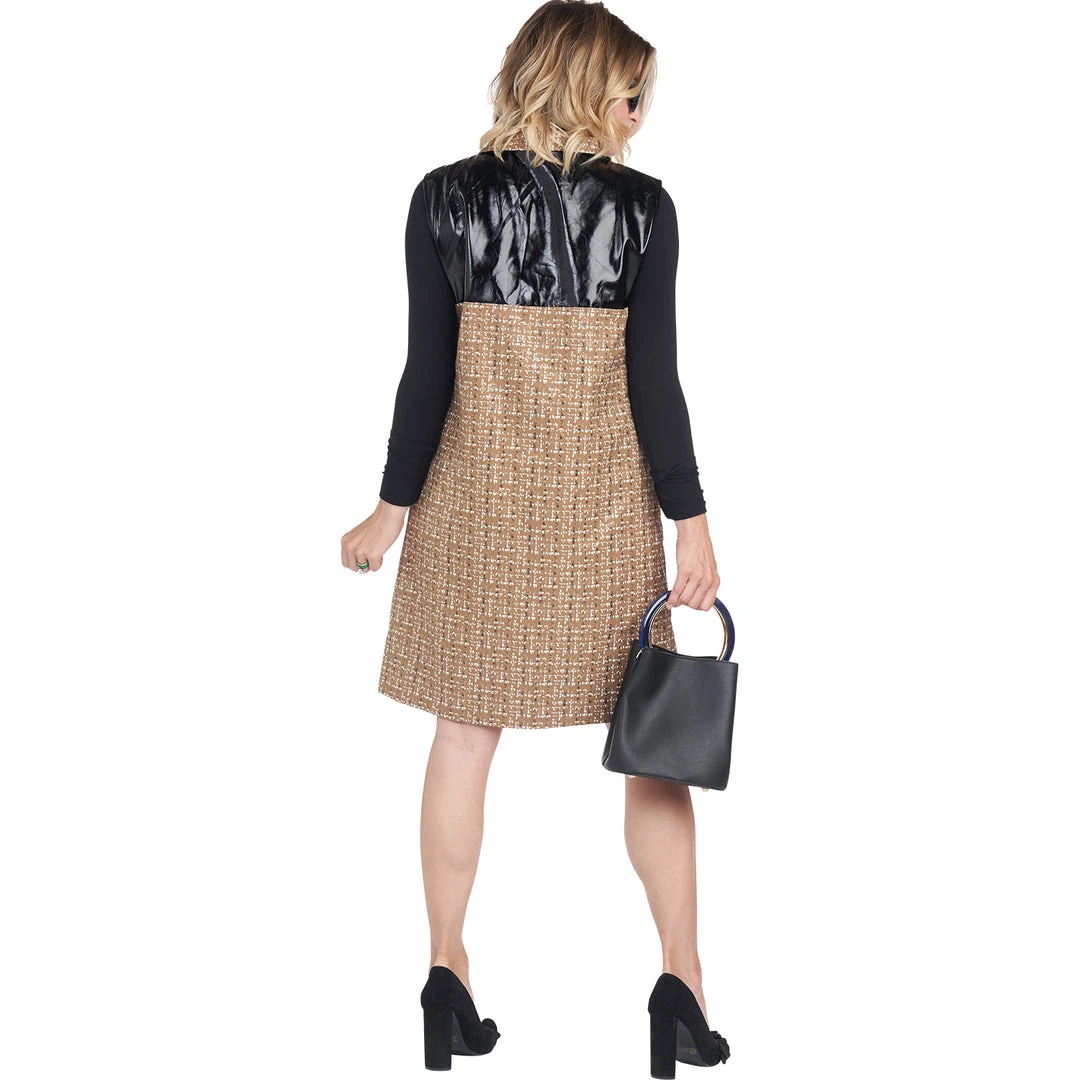 A fresh mix of Black and Tan, this Vest Dress (aka it can be worn fully unzipped as a long vest or zipped up to create a beautiful a-line shift dress) is the perfect day to night dress. Though its unique fabric looks like a tweed, it’s actually a cotton textile with a painted technique that is fully washable. The vegan leather contrast top handles all the spits and spills of motherhood like a pro. A baby wipe is all you will need.