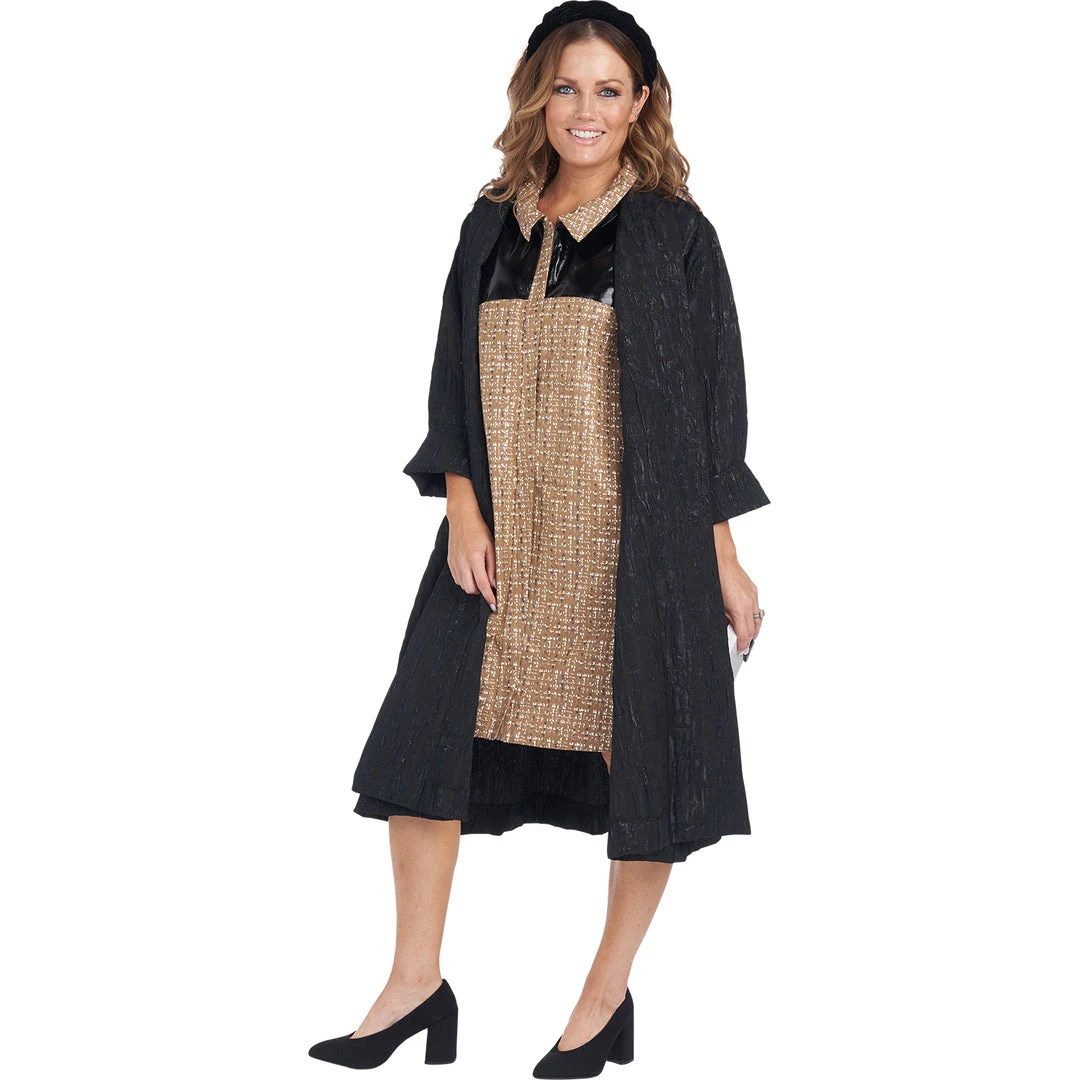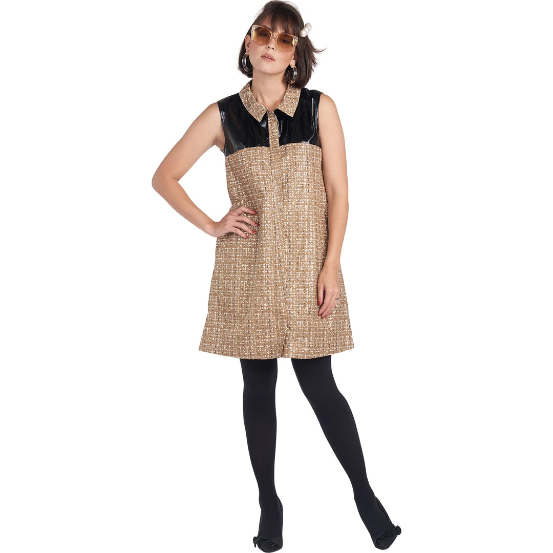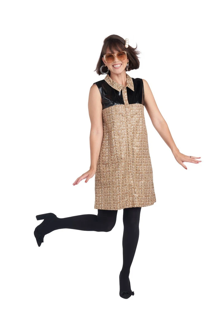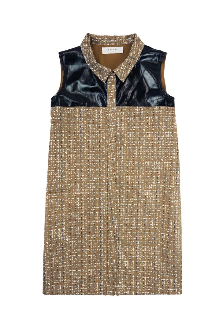 A fresh mix of Black and Tan, this Vest Dress (aka it can be worn fully unzipped as a long vest or zipped up to create a beautiful a-line shift dress) is the perfect day to night dress. Though its unique fabric looks like a tweed, it’s actually a cotton textile with a painted technique that is fully washable. The vegan leather contrast top handles all the spits and spills of motherhood like a pro. A baby wipe is all you will need.