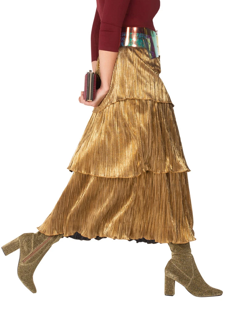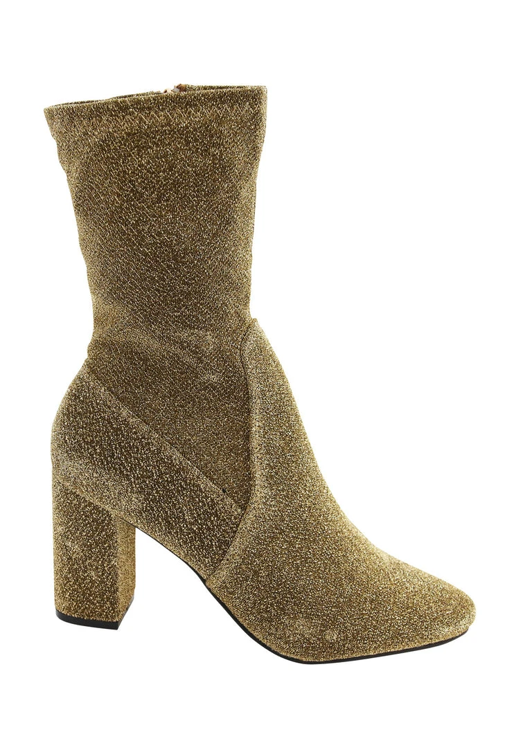 These above the ankle booties are bold and edgy. Made of a strong, metallic stretch material that gently molds to your feet. The chunky heel and round toe provide a level of comfort, allowing you to wear them all day (or night). Pair them with everything from distressed denim to pretty party skirts.